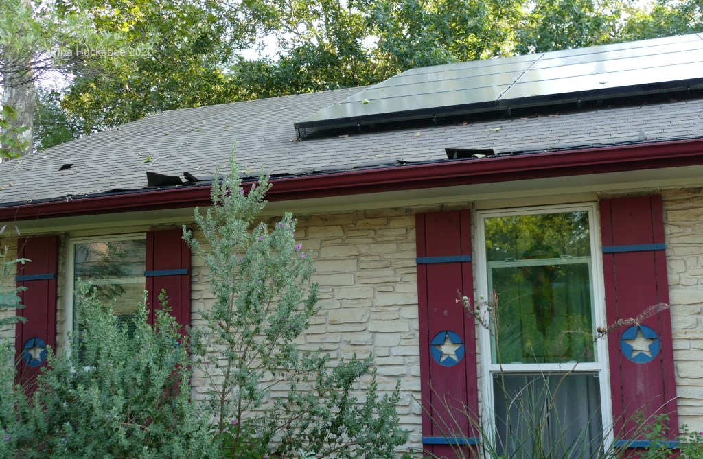 I heard some scrabbling just above my back door last night, but was too slow with the flashlight to catch the critter in the act. In that spot, only one shingle was pulled up. I then surveyed the front of my house, flashlight flashing, and could see that there were a number of mangled shingles all along the front. Daylight demonstrated the full extent of the raccoon’s activities.