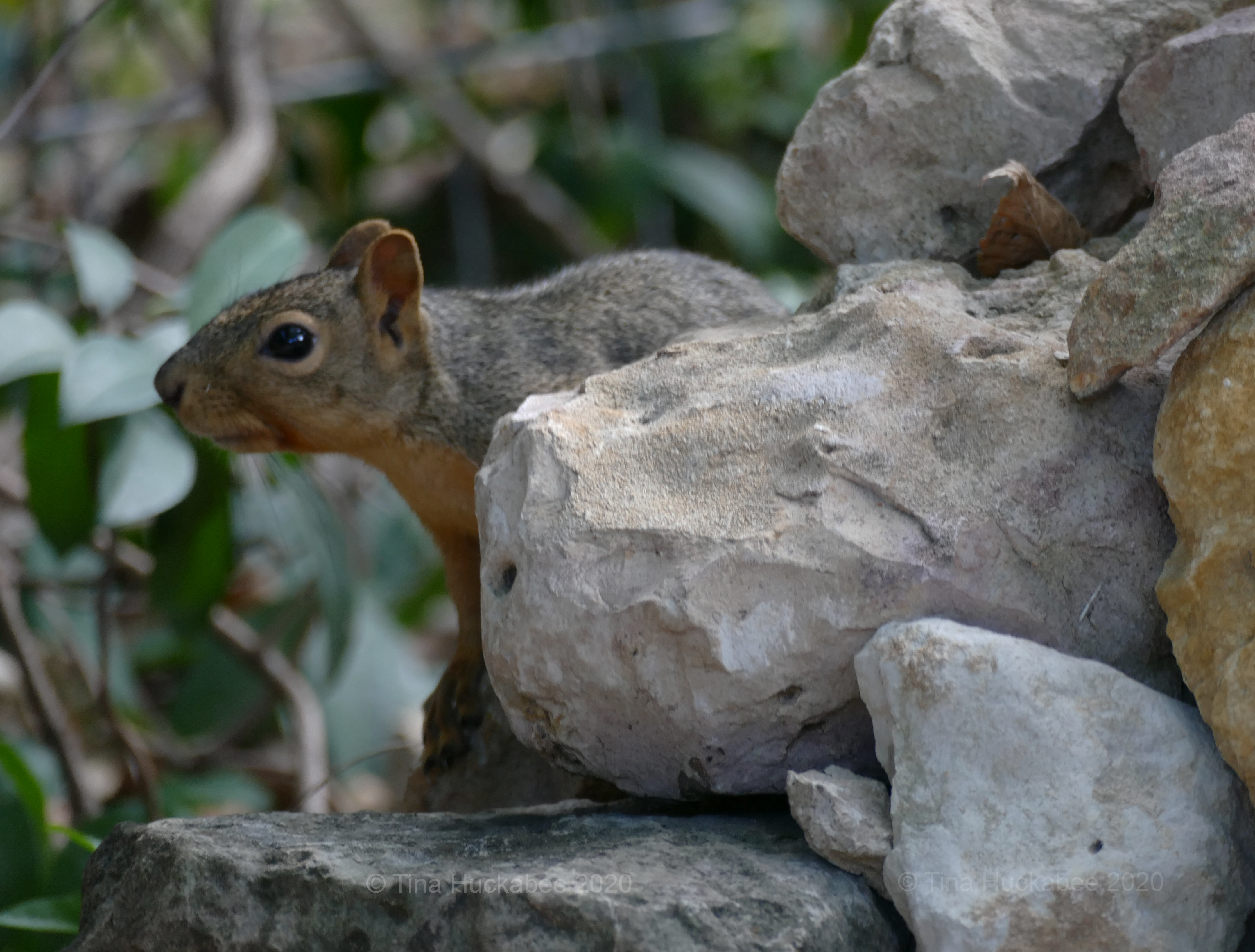 This Eastern Fox Squirrel, Sciurus niger, skittered up the rocks and scattered the birds, taking its turn for a drink at the waterfall. When disturbed, the birds disappear for a time, but they come back when all is quiet and they can bathe and drink in comfort.