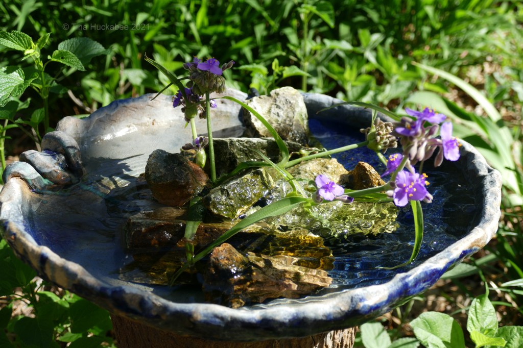 Spiderworts seed into pathways (and everywhere else) and I usually avoid them while I stroll and toil, but sometimes, my foot steps and stems break. What to do? Turns out, the broken stems they fit nicely in a bubbling bird bath, blooms still available for pollinators. So while I never contributed any blooms-in-the-birdbath photos for the fun garden meme In a vase on Monday, I was able to allow the broken flowers to achieve their pollinator potential. Lesson learned: from broken plants come renewal of life, and flexibility is a must.