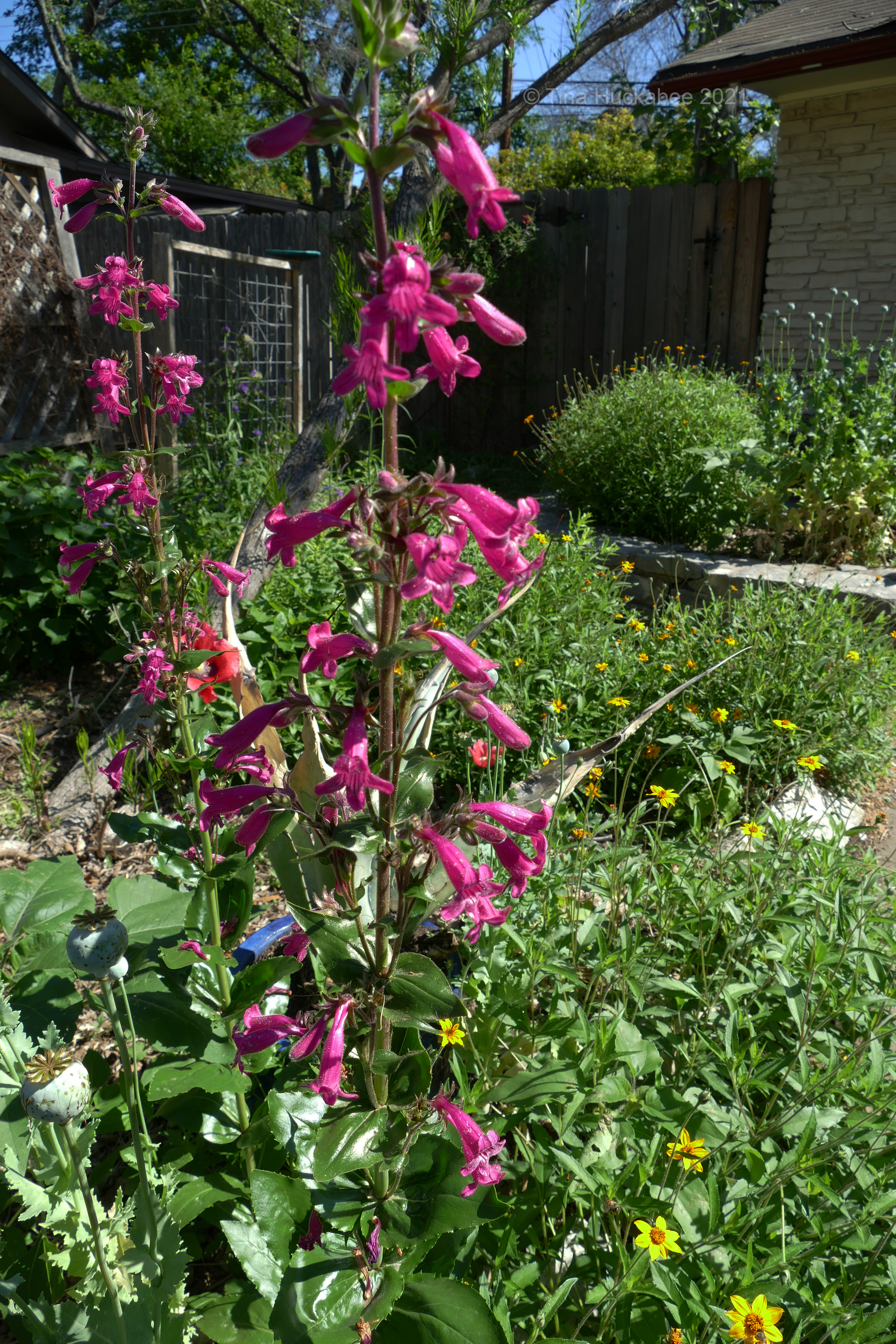 Yesterday I attempted a photo of a nectar-stealing Horsefly-like carpenter bee, Xylocopa tabaniformis, but with no success. He became annoyed with me and buzzed away. The luscious belled blooms of the Hill Country penstemon, Penstemon triflorus, stand tall and await another to benefit from its pollen or nectar. The penstemon’s sunny garden companions are the daisy-like Zexmenia, Wedelia acapulcensis var. hispida and seed pods of European red poppies.