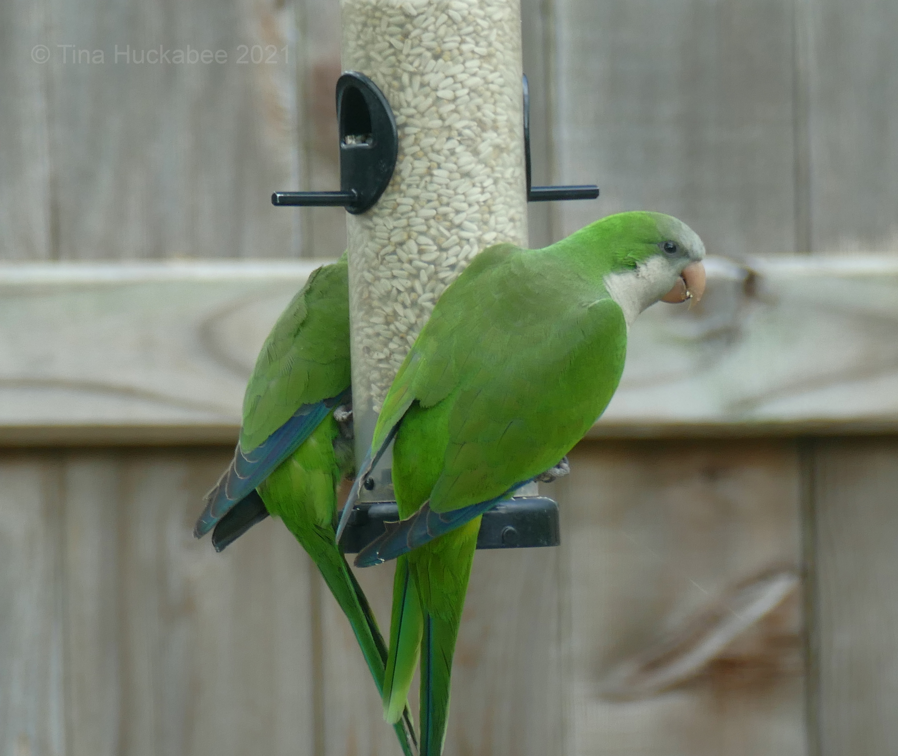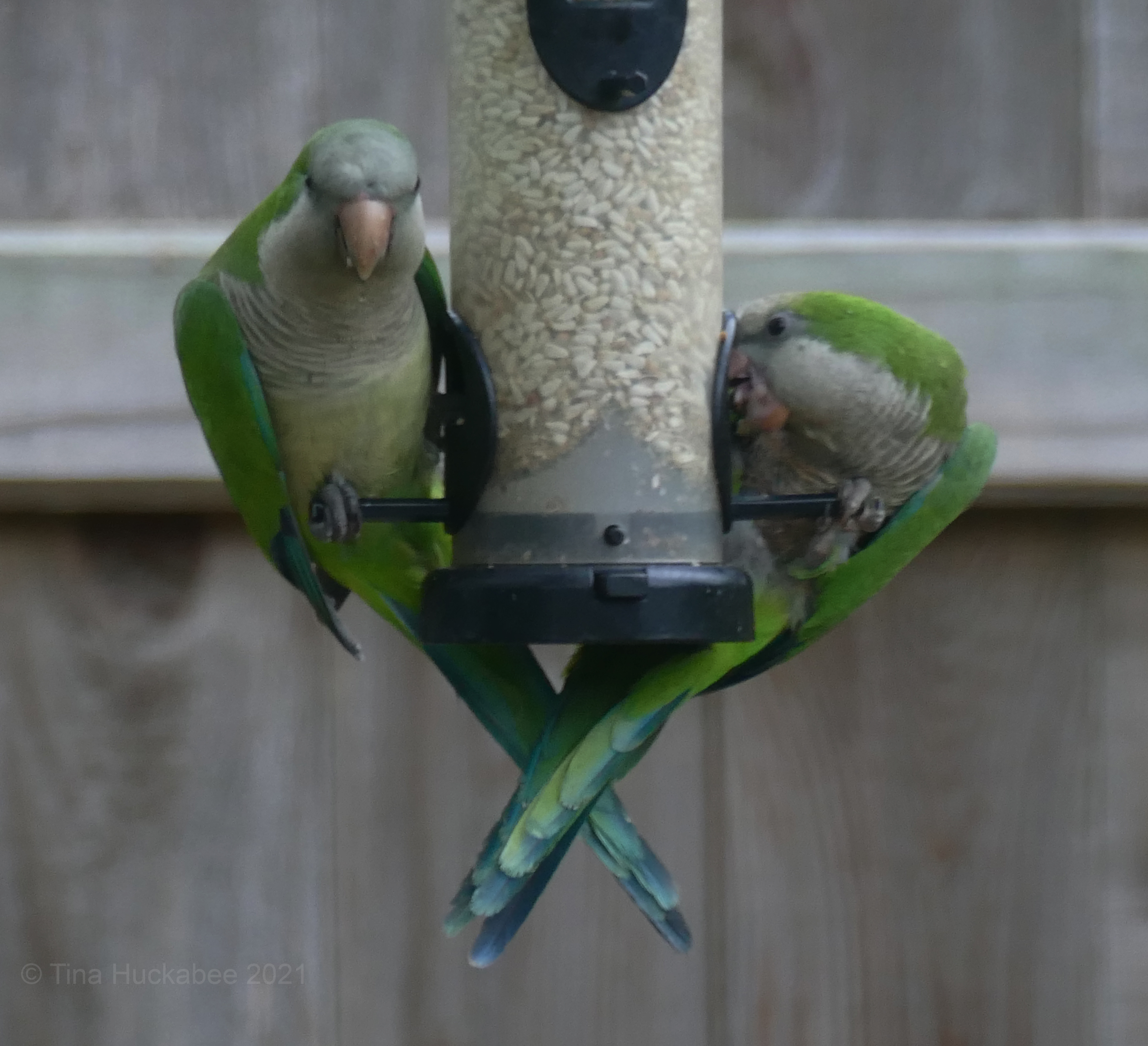 What wonderful photos, Tina! I never get to see them so close. They’re around, and I hear them often, but they tend to stick to the tops of palm trees and huge power transmission towers. I wonder if some safflower would tempt them in. It might be worth a try. Is there some other species who likes the safflower, in case none of the monk parakeets show up?