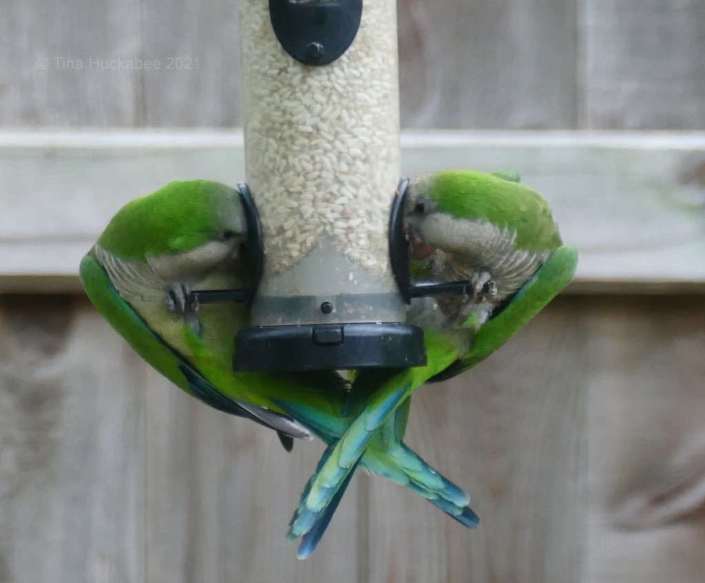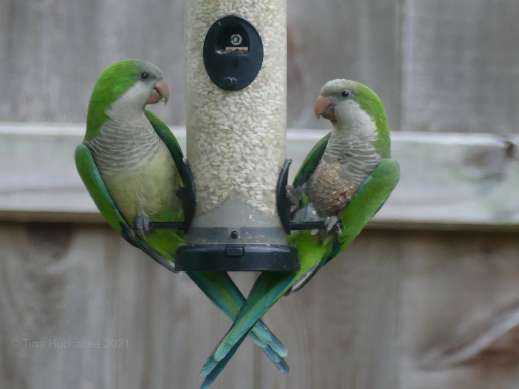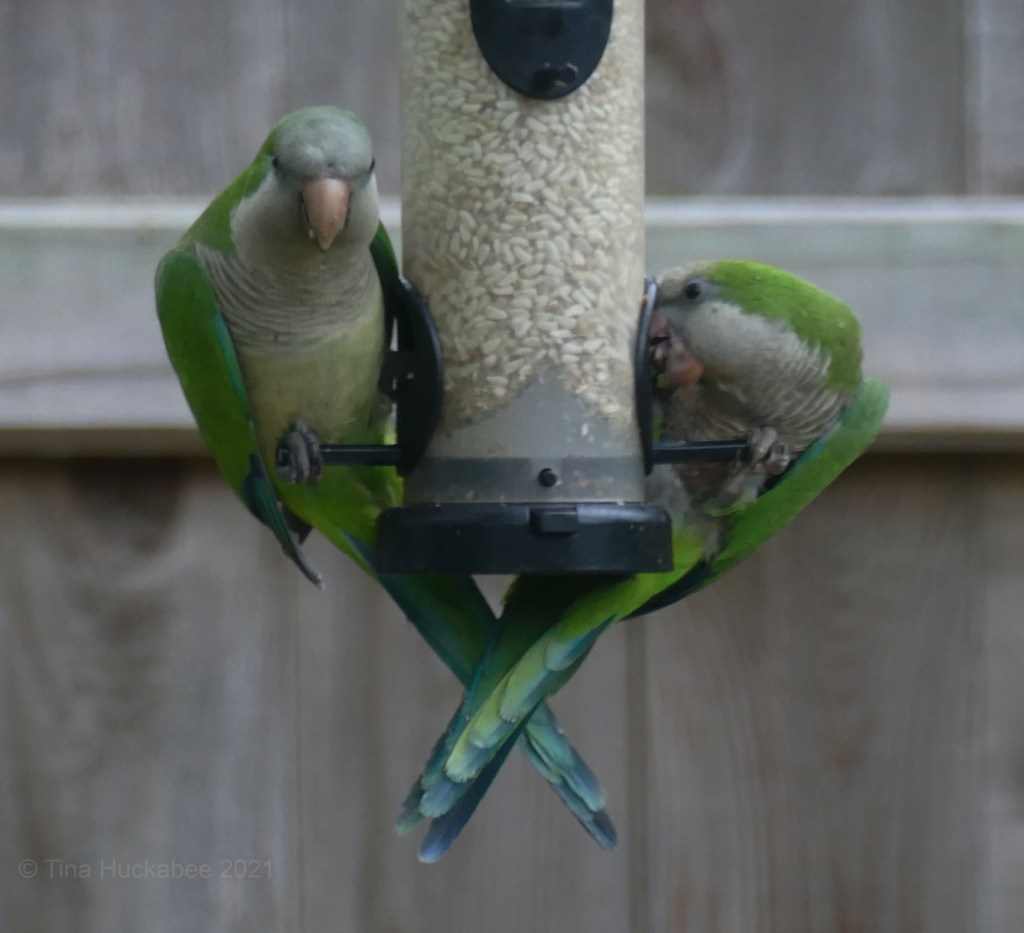 Monk Parakeets are stopping by daily for some nibbles, usually favoring the safflower feeder. It’s a pair (mates?) and so fun to watch.