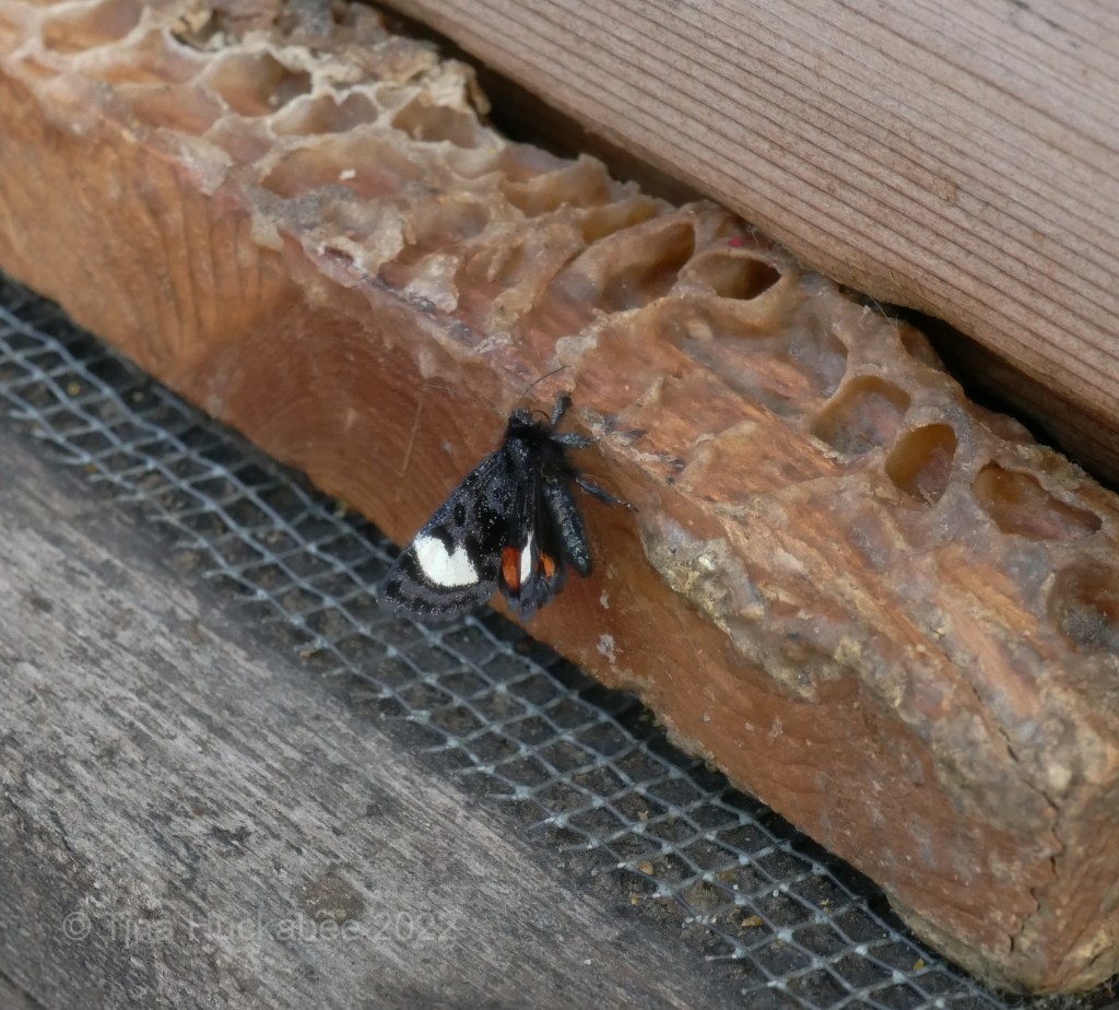 On the entry board of the hive, this stunning moth was also ambling about; the bees ignored the moth, the moth ignored the bees.