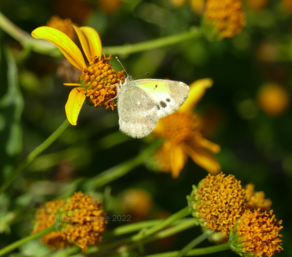 Late summer and autumn bring a number of yellow butterflies in the garden. One of the more common of the numerous yellows are the Southern Dogface, Zerene cesonia. This one enjoys what Mexican Honeysuckle offers.