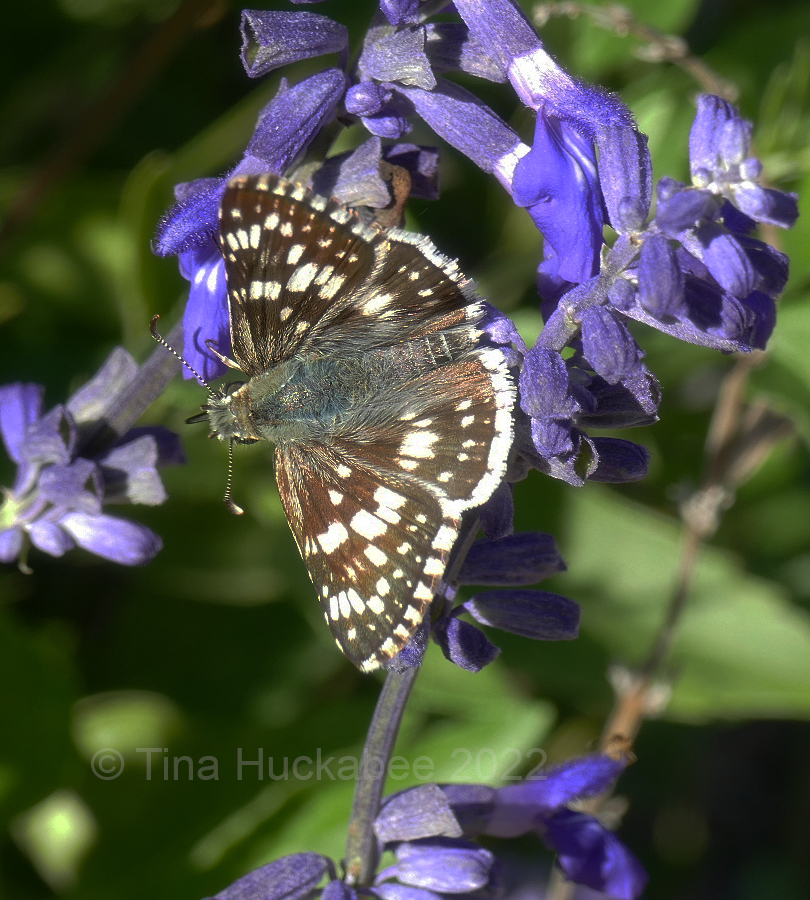 Common Checkered-Skipper, Burnsius communis, is a butterfly that lives in most of the continental United States. A large skipper, it’s also a skipper that cooperates with its human admirers–look at that lovely wingspan. These skippers use plants in the mallow family as their hosts and I grow several: Turk’s Caps, Globe Mallow, and Rock Rose. It’s no wonder that these butterflies are in my garden for late summer and fall.