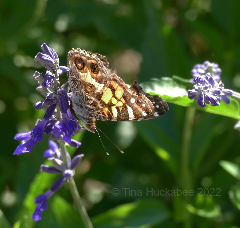 American Lady, Vanessa virginiensis, are also regulars in Central Texas. This one nectared on the prolific blooms of a Henry Duelberg, Salvia farinacea.