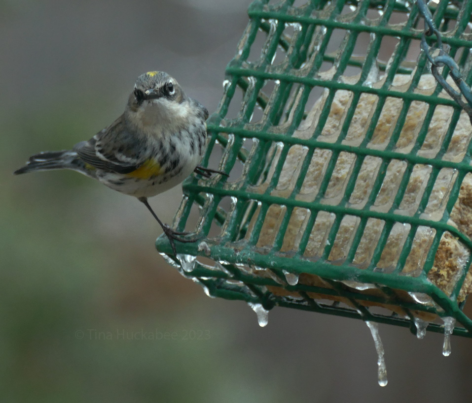 …is the self-appointed Badass Bird King of the Garden, chasing the other Yellow-rumps and Orange-crowns away from “his” feeder. The little stinker dominated the icicled suet feeder during the ice storm in January.