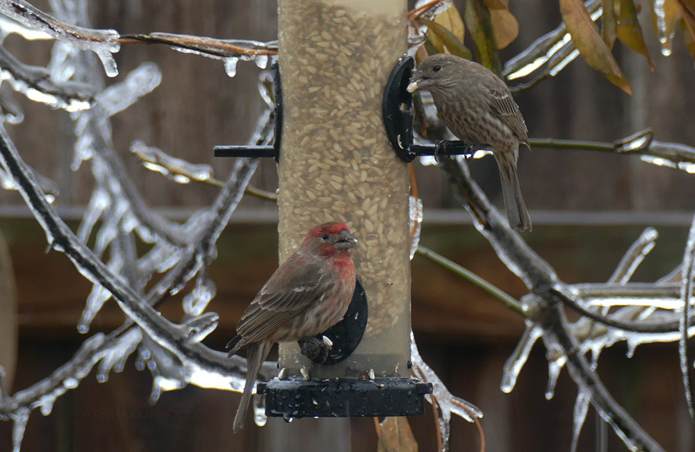 This couple didn’t mind dining amongst the icicles. Their favorite food are safflower seeds, but they also eat sunflower seeds and sometimes, peanuts.