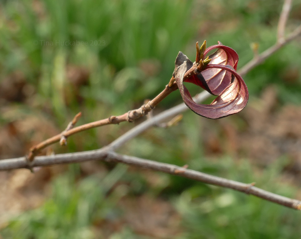 The change of time on a Roughleaf Dogwood, Cornus drummondii, as told by emerging spring foliage, replacing fall leaves.