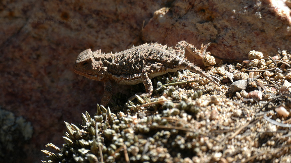 As well as many birds, there were also lots of reptiles, skittering across the trail ahead of our footsteps and scaling up rocks and trees. It’s been years since I’ve seen a Texas Horned Lizard, Phrynosoma cornutum; I grew up calling these charmers Horny Toads, but their range also includes New Mexico. I remember them fondly from my childhood–they were fun to observe as they’re so ugly they’re cute. I didn’t see any Texas Horned Lizards on this trip, but we saw a couple of Greater Short-Horned Lizards, Phrynosoma hernandesi, who are just as darling as Texas Horned Lizards. Sadly, both species have declined, due to pesticide use, loss of habitat, and the pet trade.