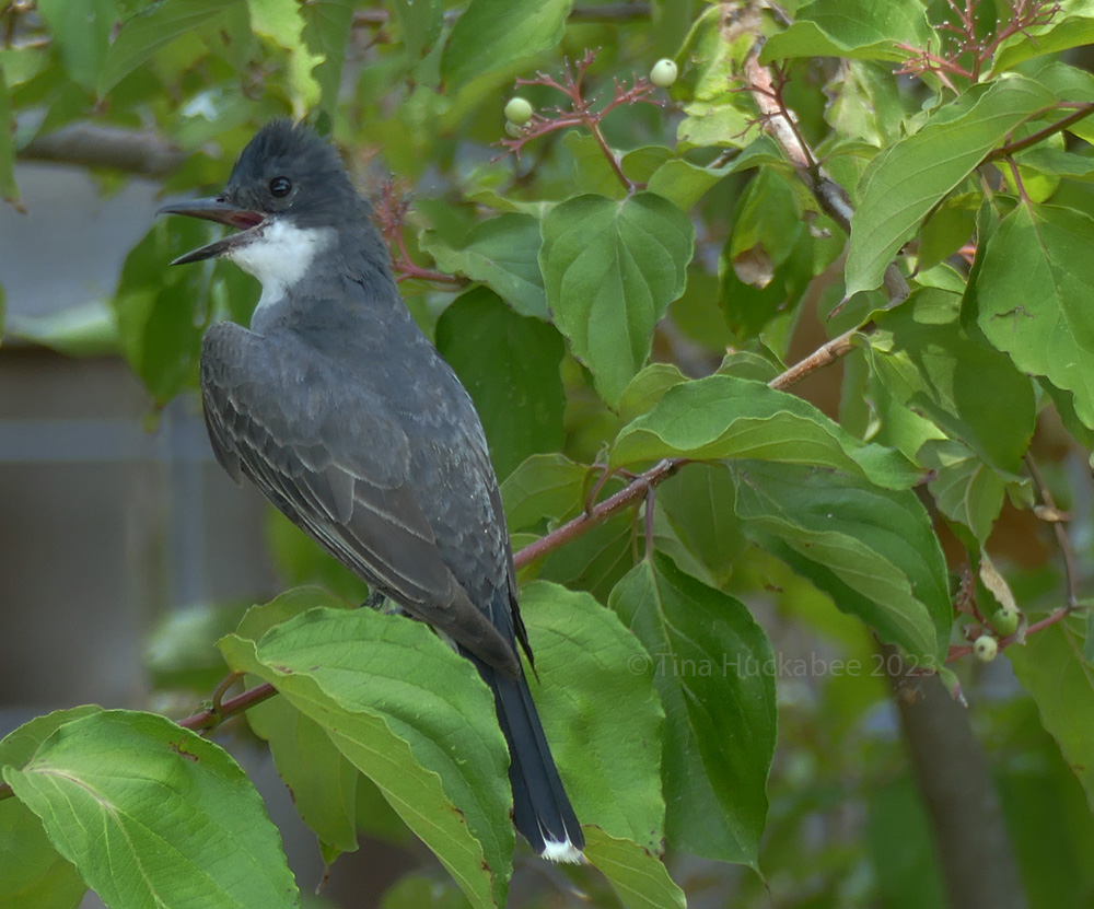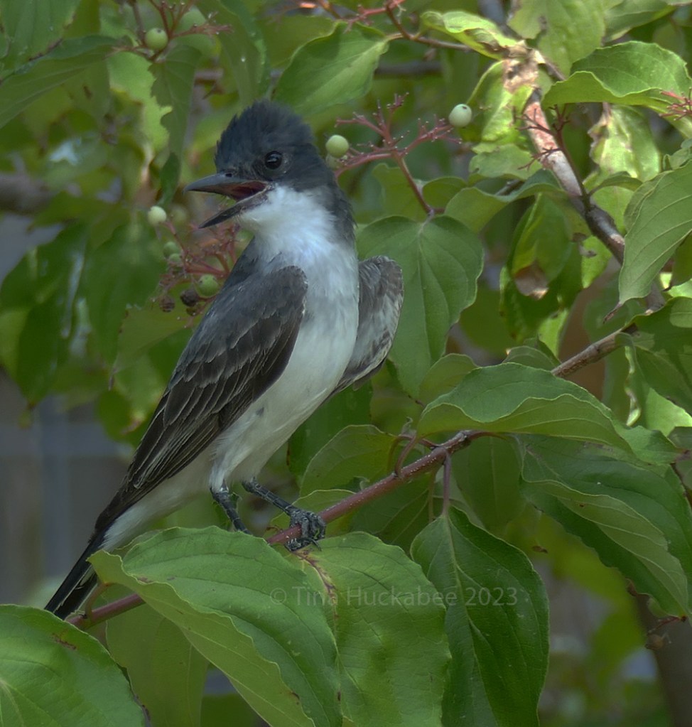 Cornell’s Kingbird information mentions a red crest that these territorial and aggressive birds flash as a challenge to a predator. This one didn’t exhibit any red that I saw, though it clearly has a defined crest. I’m guessing this is a female or juvenile male bird. As adorable as it looks, these birds are bullies! They have no problem going after bigger birds like hawks and crows, and are aggressive with other birds and small mammals. Apparently, this bird is appropriately named in both its common name (Kingbird) and its scientific name (Tyrannus tyrannus). The good folks at Cornell remind us that the term Tyrannus means “tyrant, despot, or king.”