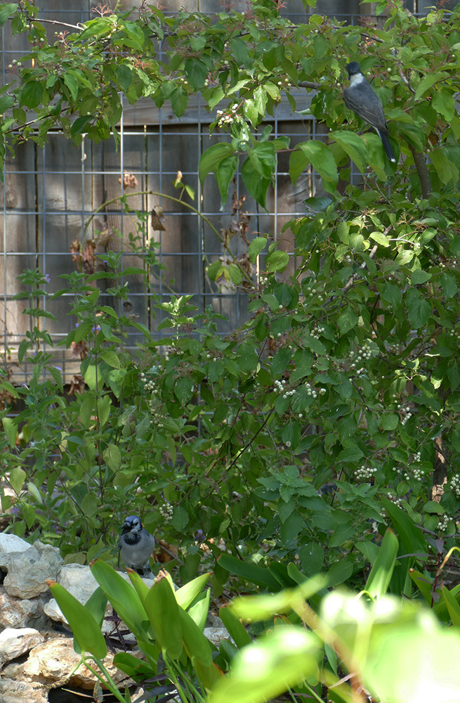 Kingbird perched in the Dogwood, above the lowly Jay, no doubt lording over its temporary territory. The Blue Jay stayed near the bog area of the pond, just hanging out, being a Jay.
