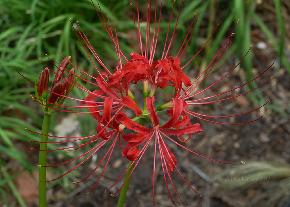 I say that I’m surprised when these lilies show up, but of course, I’m not, not really. I planted the bulbs and even in the most droughty of years, I always enjoy the sight of few Oxbloods and Spiders when they show up, popping with vibrancy. In wet years, the show is spectacular. That red!