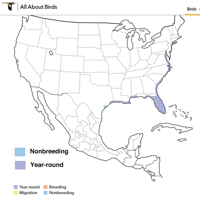 This is the Cornell map of Boat-tails’ range and it’s clear that this Boat is out of its normal stomping and bathing grounds. Along the east coast of Texas, some hundreds of miles east of my garden, one blob of blue indicates a non-breeding area for these birds, and nearby, a smidge of lavender, which is part of the Boats’ breeding range. Neither of these are anywhere near my pond!