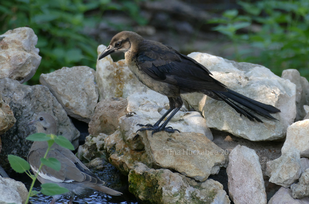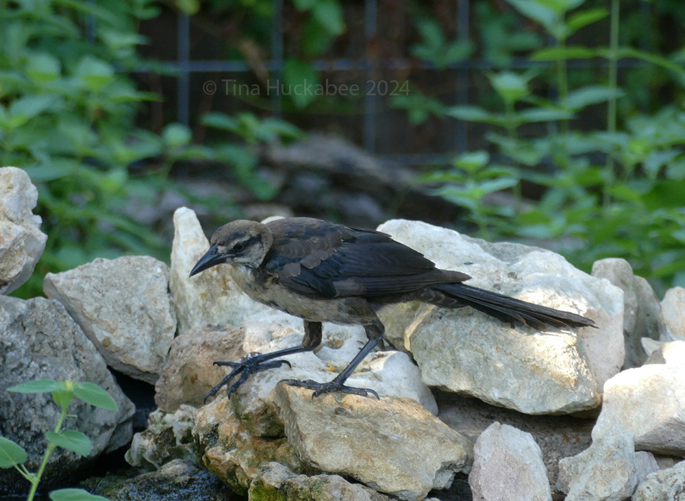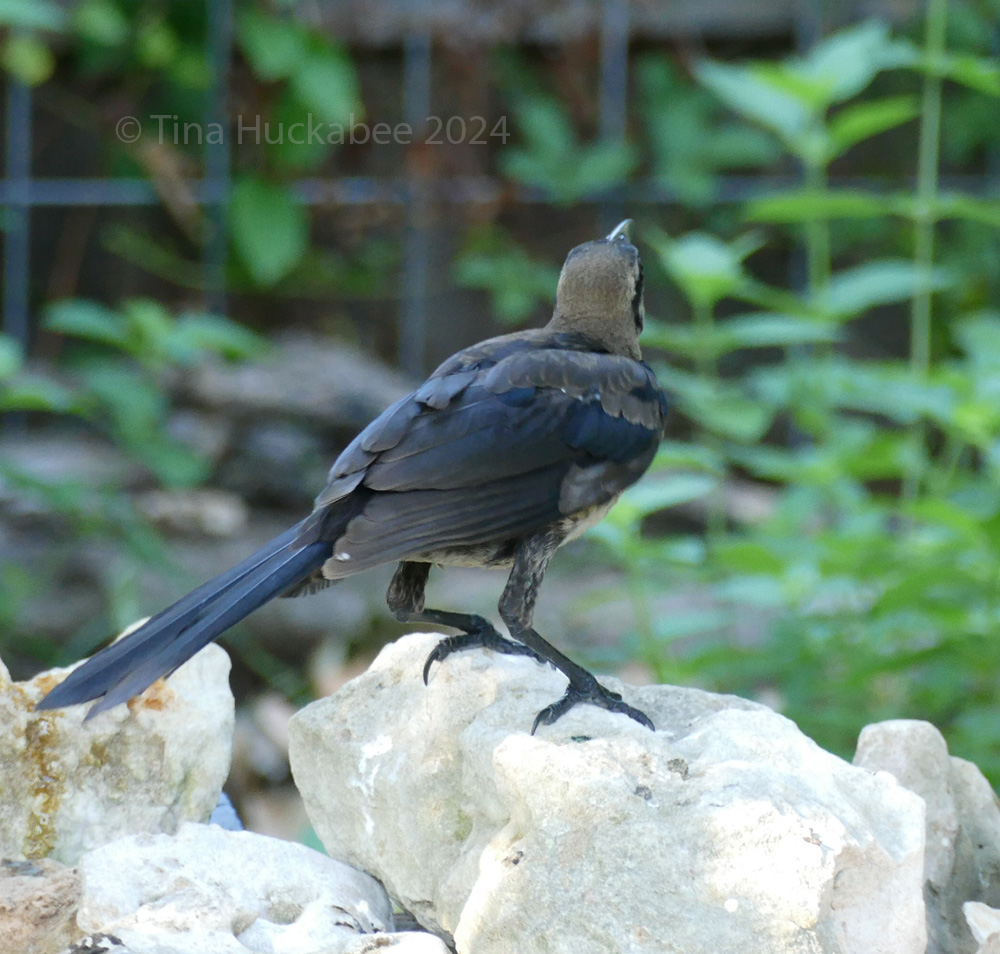 A new-to-me bird has visited the back garden this past week. I thought it kinda looked like a grackle, but it’s larger than either the Common Grackle or Great-tailed Grackle that are the usual grackle suspects here in Central Texas. Also, it has a mottled coloring, which I assume means either a juvenile or a female bird. It likes water. A lot. From the waterfall and bog of the pond, to the shallow bird baths nearby, this bird likes to bathe, spending most of its time splashing and dipping its impressive beak.