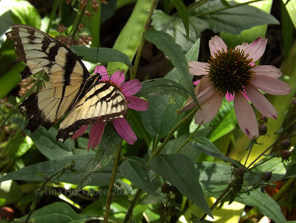 Spring bloomers are nearly done and those that are hanging on into late summer are tired, much like this cluster of Purple Coneflower, Echinacea purpurea. Their weariness didn’t lessen the attraction for a Tiger Swallowtail, Papilio glaucus, though. It sipped, then flit–as butterflies will–before moving on to its next snack.