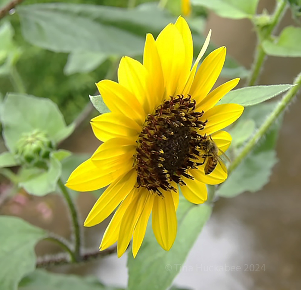 Most of the sunny summer sunflowers are spent, having segued from providing rich nectar and plenty of pollen, to offerings for birds and mammals in the form of seeds. There are a few flowers open for pollinator business and our honeybees never miss a trick when it comes to open flowers.