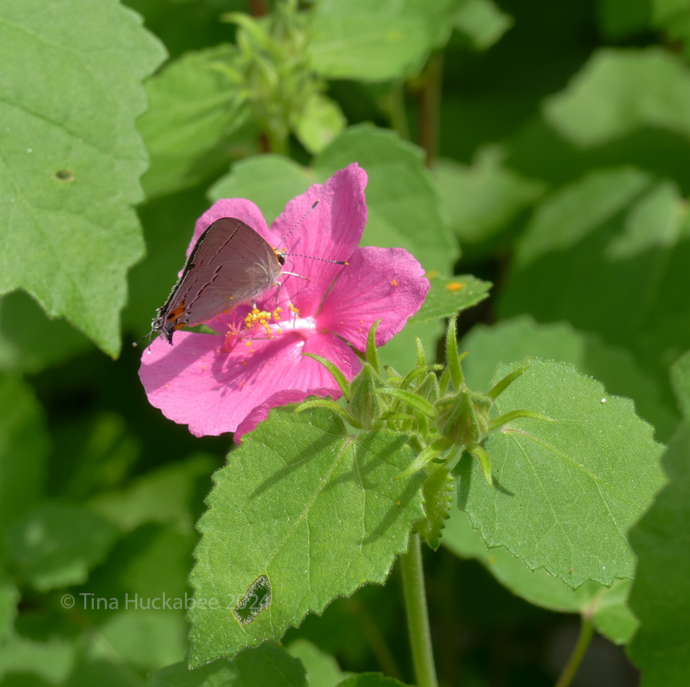 My Rock Rose, Pavonia lasiopetala, shrubs have flowered non-stop since early May. A garish, Barbie-pink bloom, some gardeners don’t care for the flowers, but I love this plant, as do a wide variety of pollinators, like this Gray Hairstreak, Strymon melinus,
