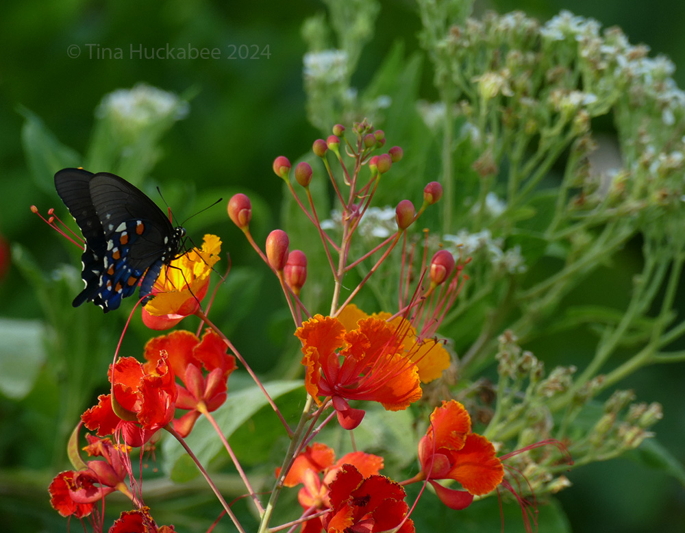 This beauty drifted from flower to flower, settling on a fiery Pride of Barbados for this nectaring session. The snowy Frostweed in the background also saw visits from the Pipevine.