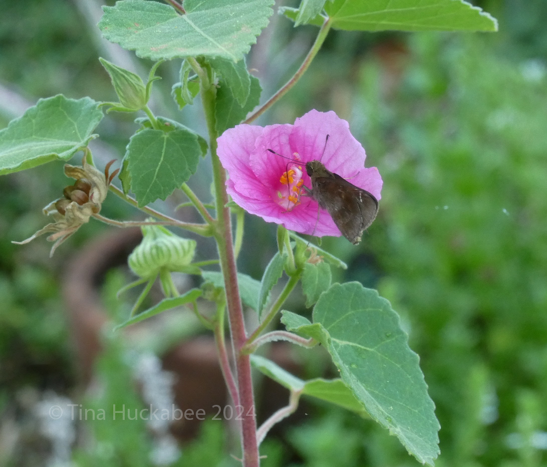 My Rock Rose, Pavonia lasiopetala, shrubs have flowered non-stop since early May. A garish, Barbie-pink bloom, some gardeners don’t care for the flowers, but I love this plant, as do a wide variety of pollinators, like this Gray Hairstreak, Strymon melinus,