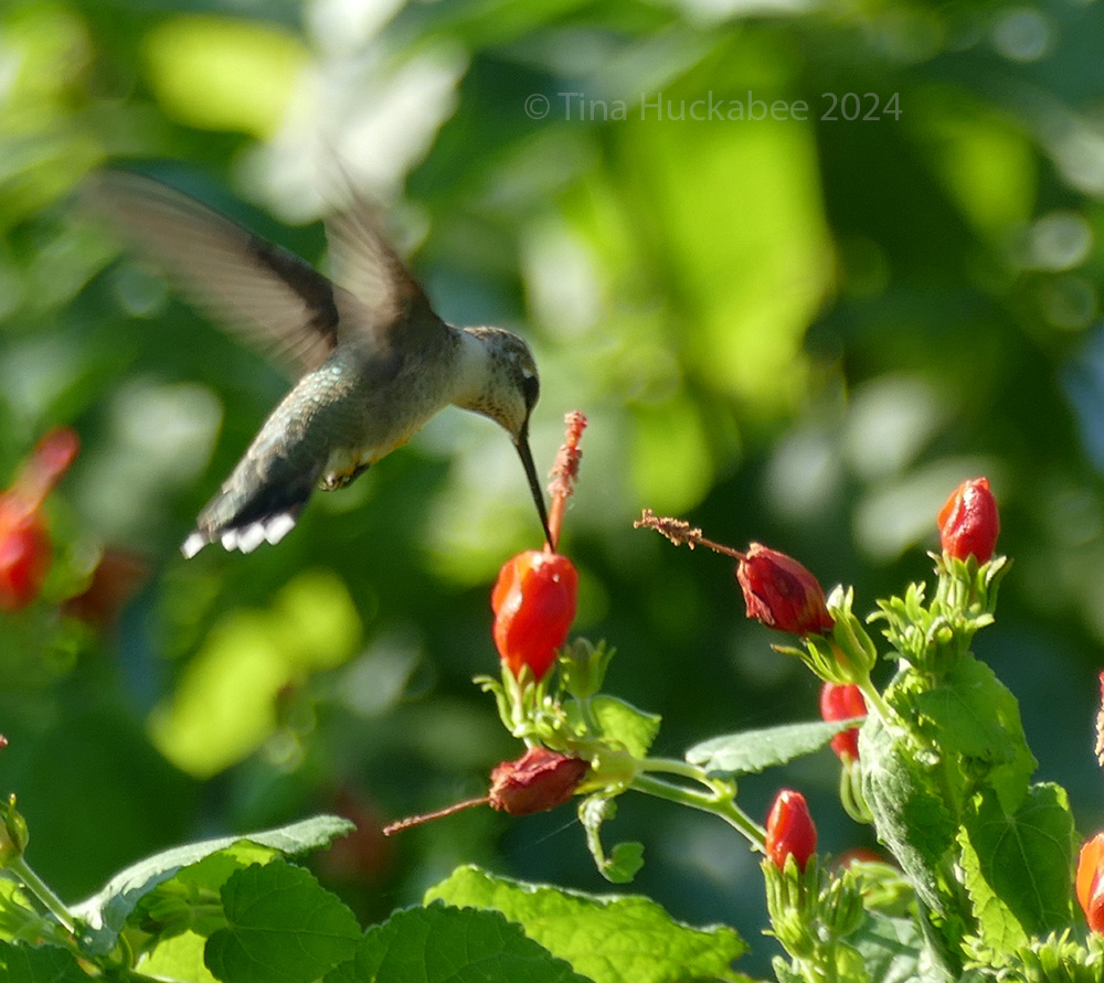 This female Black-chinned Hummingbird, Archilochus alexandri, stopped to re-fuel with some Turk’s Cap, Malvaviscus arboreus var. drummondii. Stopped is not the correct word; maybe slowed down is a better description of the hovering motion as it fed from the crimson cap.