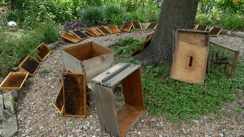 We dismantled the hive, laid the parts–boxes and frames–in the garden, preparing to freeze the frames to kill any wax moths or other invasive insects and their eggs. We’ll wash the hive boxes with a bleach/water mixture to kill eggs snuggled in cracks and crevices.