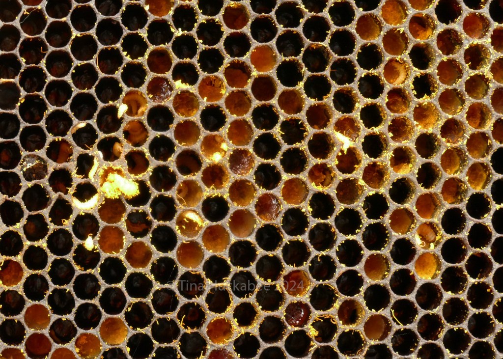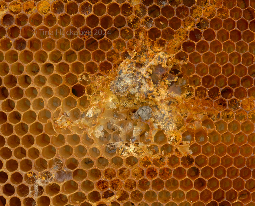 If you look carefully at the comb cells, you can see some of the small, newly hatched larvae.