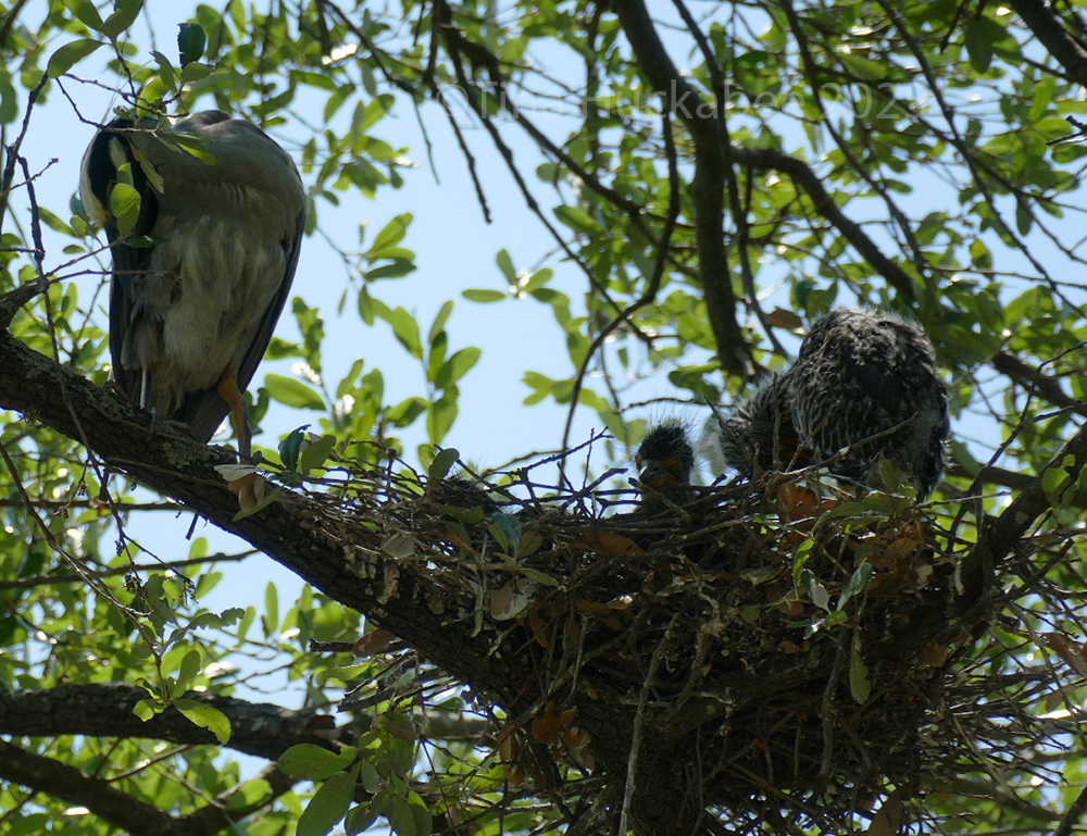 I’ve been watching the hawks since late March, but only two weeks ago discovered that across the street, situated in a large Live Oak, Quercus virginiana, a family of Yellow-crested Night Herons, Nyctanassa violacea, have also settled in for their chick-raising. Bird neighbors! I’m guessing these two feathery families don’t share meals or coordinate play dates for the kids! I find it fascinating that these two large predator birds are relatively close together and are raising successful families. That said, while both species hunt, they hunt different prey, so there’s probably not much competition for food, at least between the families.