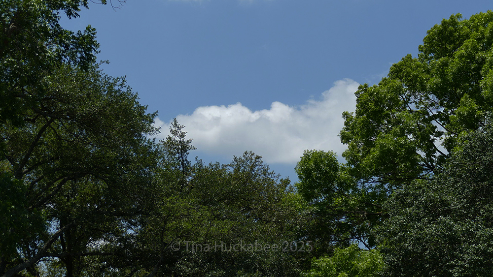 Puffy clouds act as a visual connection between the hawks’ home tree on the right and the herons’ home tree on the left. The street sits just below, bisecting the two properties.