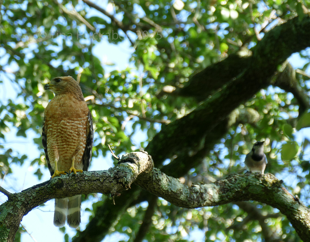 Dad hawk looks rather disdainful of the intrusion; he flew to a different branch a minute later, jay in noisy pursuit.