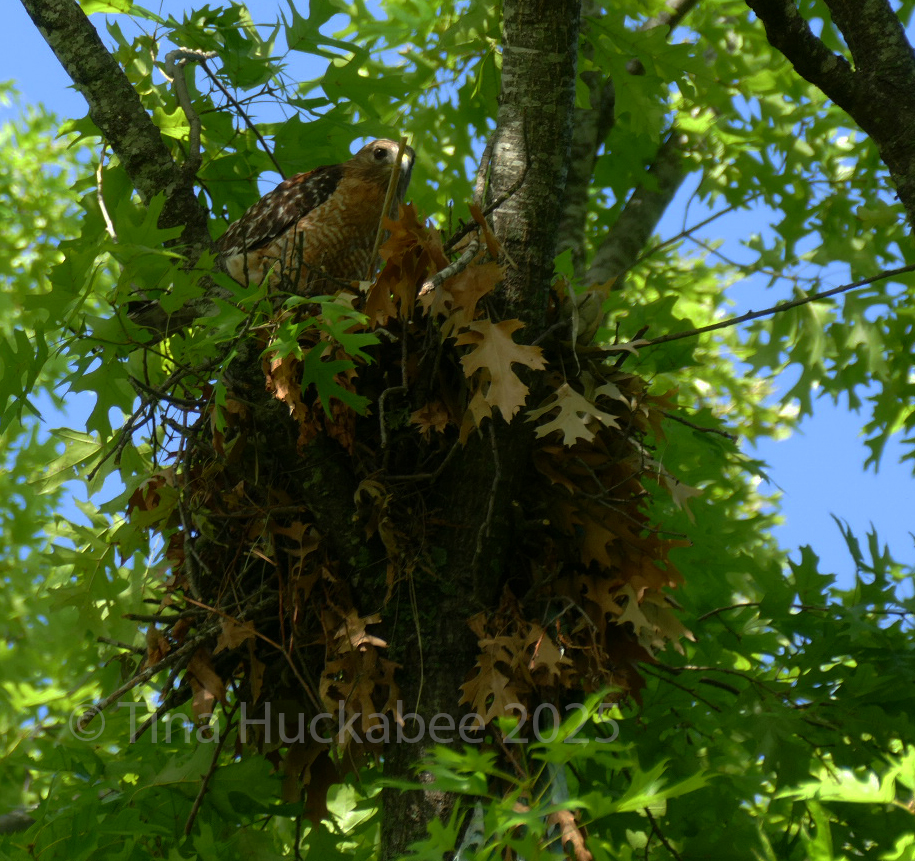 Mom hawk is in the nest, caring for the wee ones, hunkered down in their solidly built oak-leafy nest.