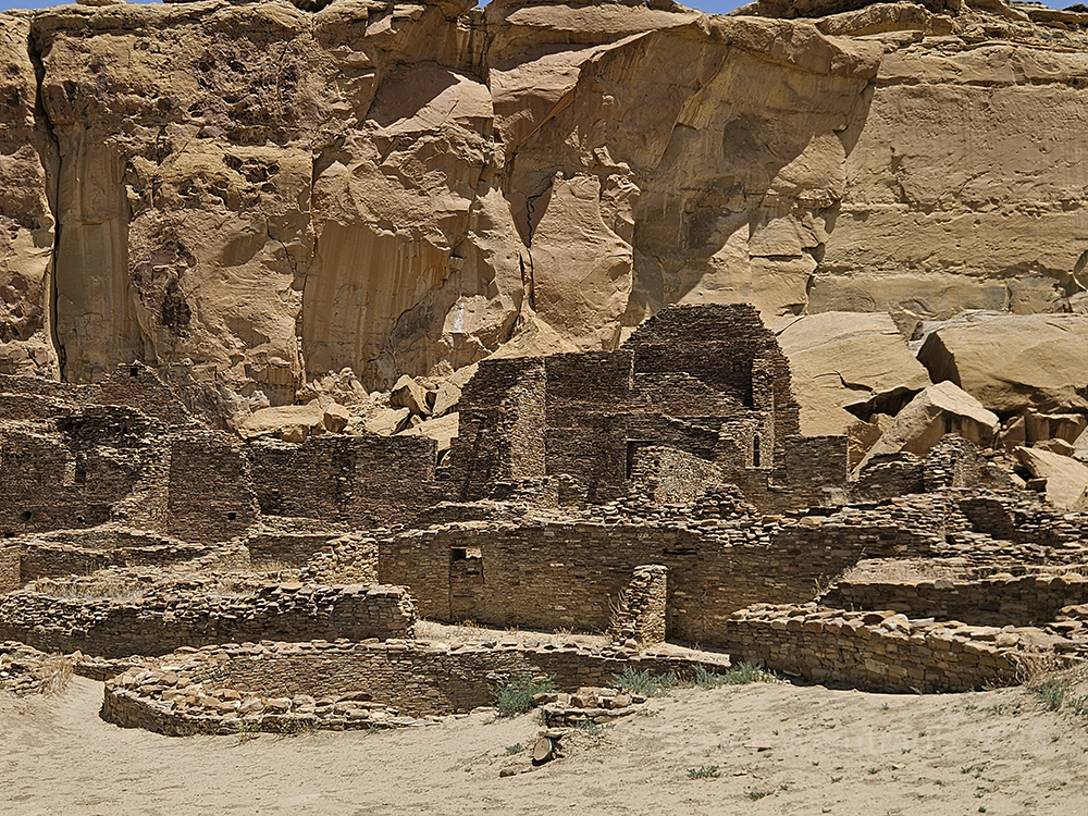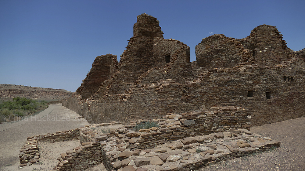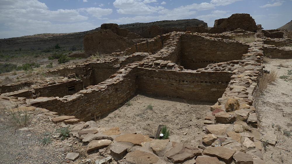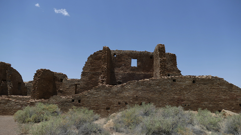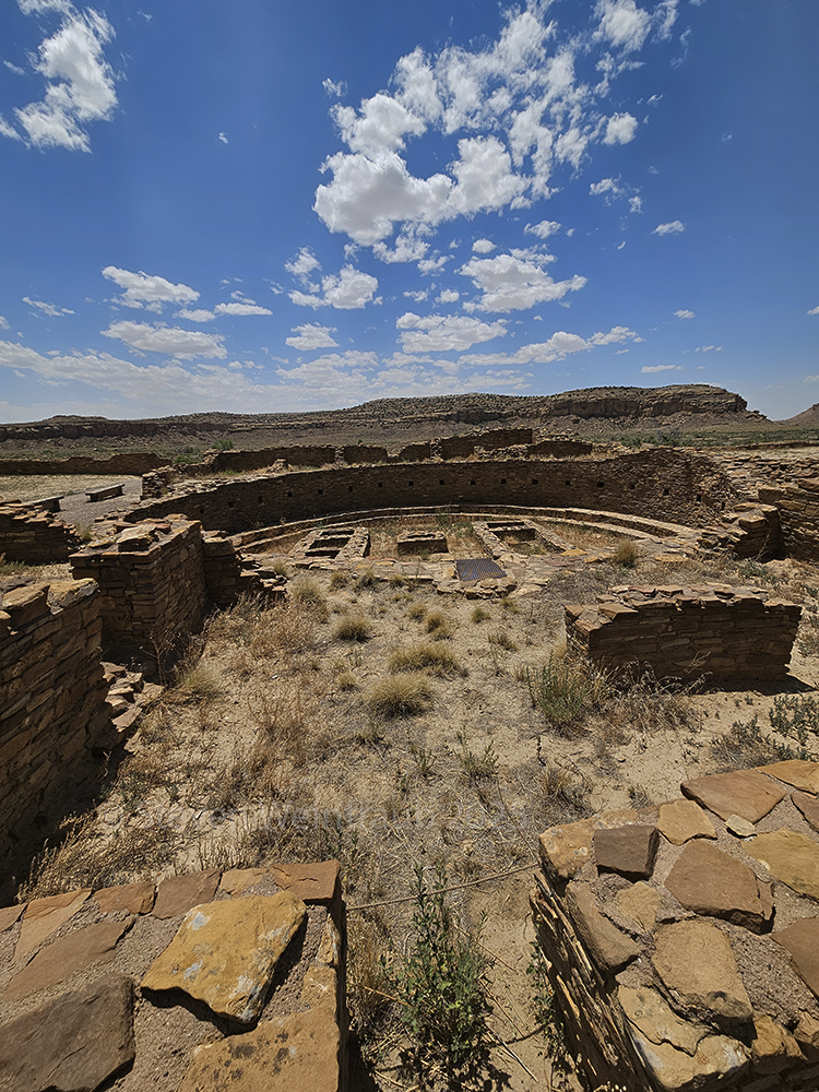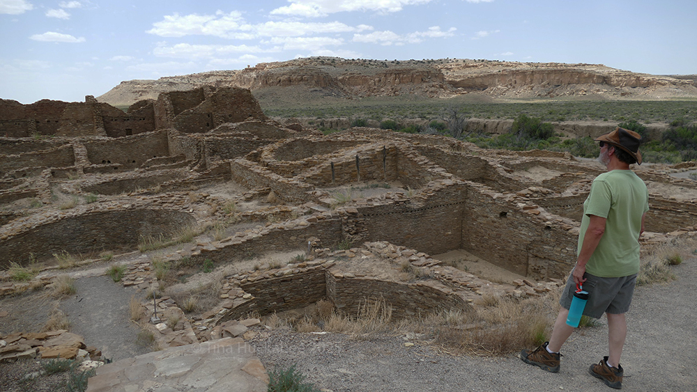 In June we spent time in New Mexico, re-visiting favorite spots and adding a couple of new adventures to our itinerary. We’ve always wanted to visit Chaco Culture National Historic Park and finally made it happen. Chaco Canyon is located in the northwest corner of New Mexico, bordered on three sides by mountain ranges: the Chuska, the San Juan, and the San Pedro. The canyon was created by the Chaco Wash in the San Juan Basin which is part of the Colorado Plateau. All that geography is very interesting of course, but the bottom line is this: this remarkable place in North America is kind of in the middle of nowhere.