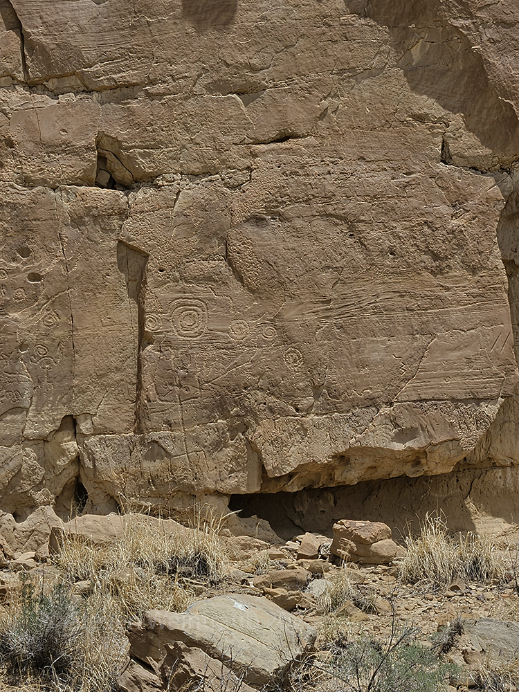 Like many ancient cultures, Chaco’s architecture reflects knowledge of Earth’s connection to the sky and seasonal changes. We visited the day before the summer solstice and learned that there was an event at 5:15 the next morning, the sun rising at a particular point, aligning with two spiral petroglyphs at the Sun Dagger on Fajada Butte. It’s believed that petroglyph acts as a seasonal calendar. The National Park Service allows a maximum of 100 people for this kind of event and they don’t take reservations. We would have loved to participate, but with no guarantee of admission after a 75 mile drive beginning before 4am, it was a no-go for this vacation. Maybe next time…