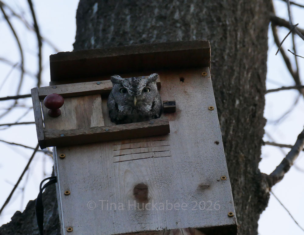 Lookee who’s here! Ms. Screech has been in our nest box for a week, poking her cute head out just after sunup and just before sundown. As well, I see her and her mate perched in my small trees or on the wooden fence if I’m outside near sundown. She seems comfortable with me, never skittish and hiding herself when I offer her a cheery ‘Hello!’.