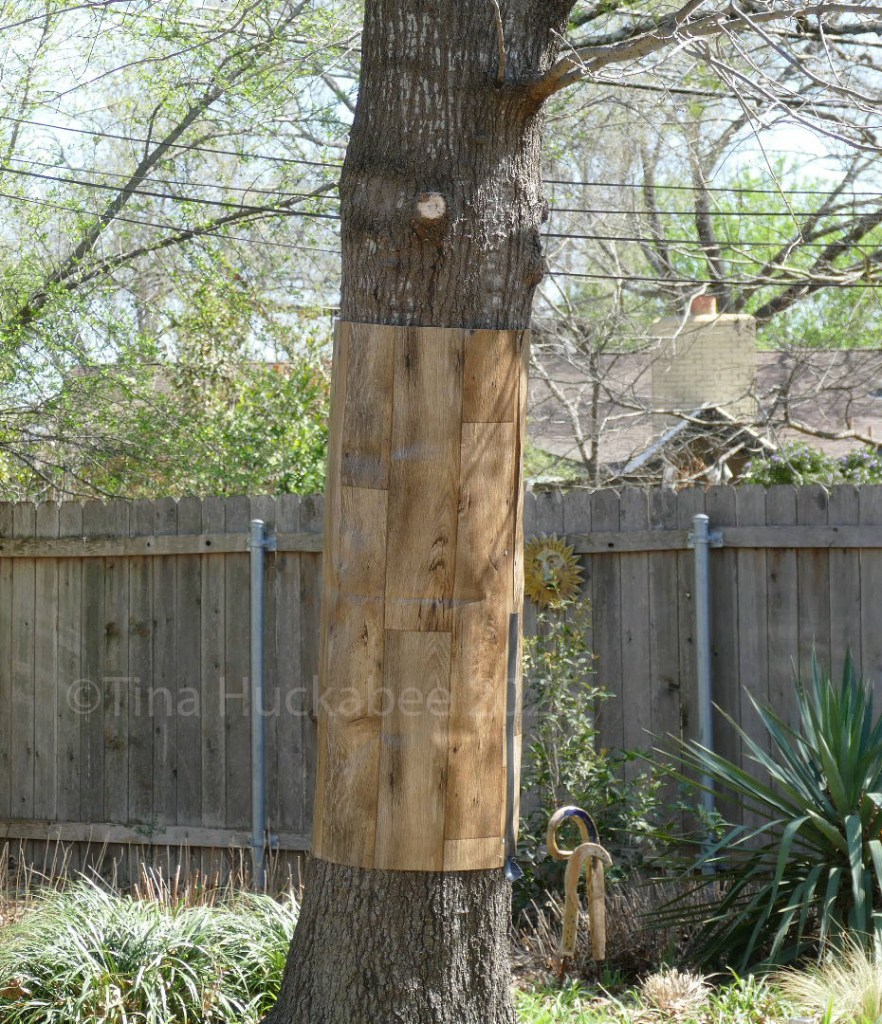 Since it appears that she’s chosen this box to nest in, we recently wrapped the tree with a sheet of vinyl flooring.