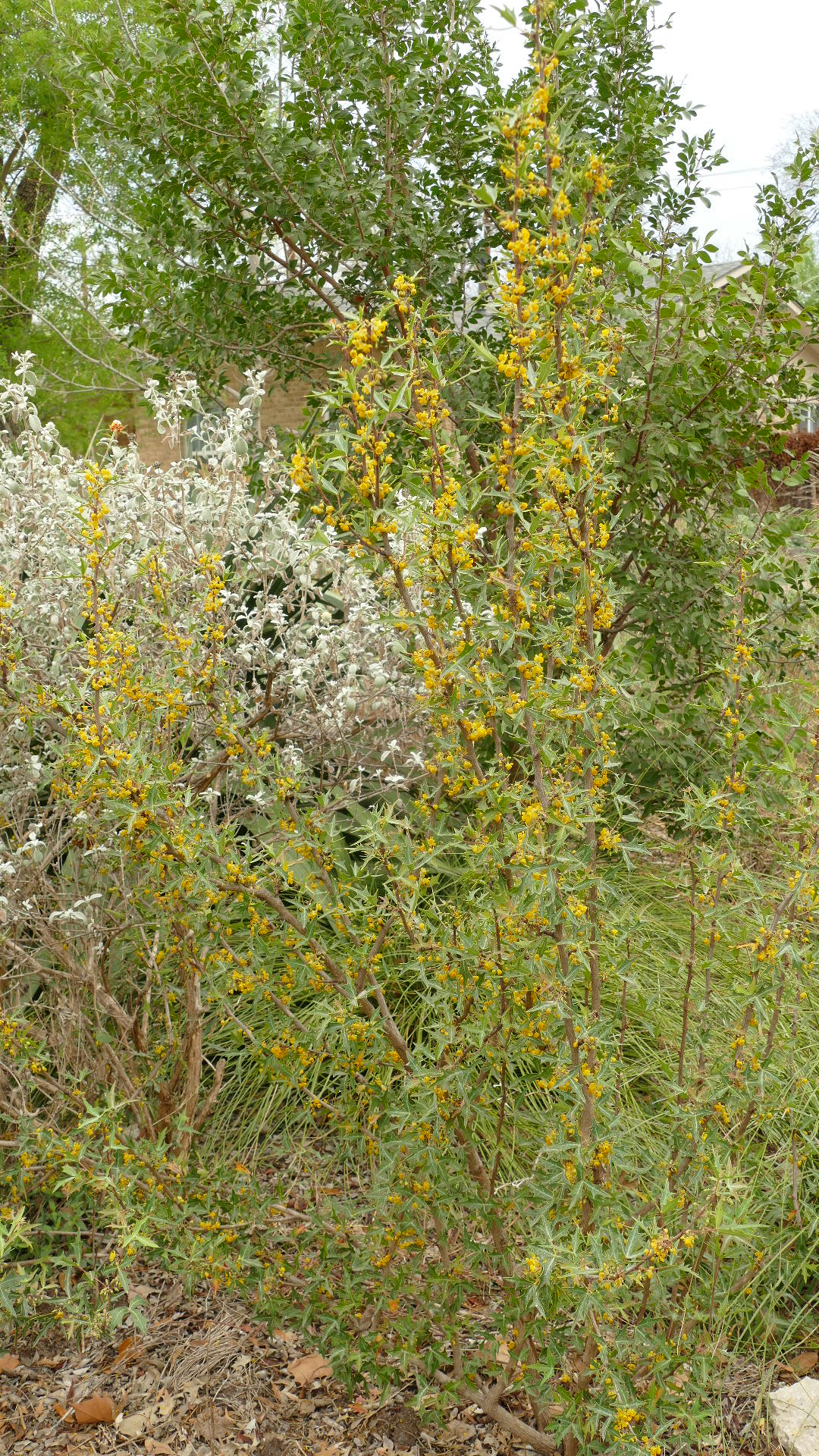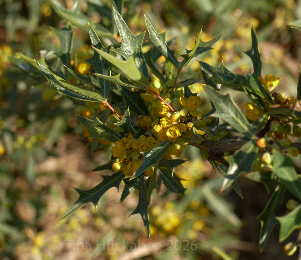 Another rangy plant which is a neighbor to the Butterflybush, are two specimens of Agarita, Mahonia trifoliolata. I’ve always wanted Agarita in my garden and finally planted these two 5 years ago when my front area became full sun. Each has grown apace, producing early yellow blooms for bees, followed by yummy fruits for birds and mammals. Humans also enjoy the berries, which can be made into wine and jelly, though this human is glad to leave the fruits for the critters.