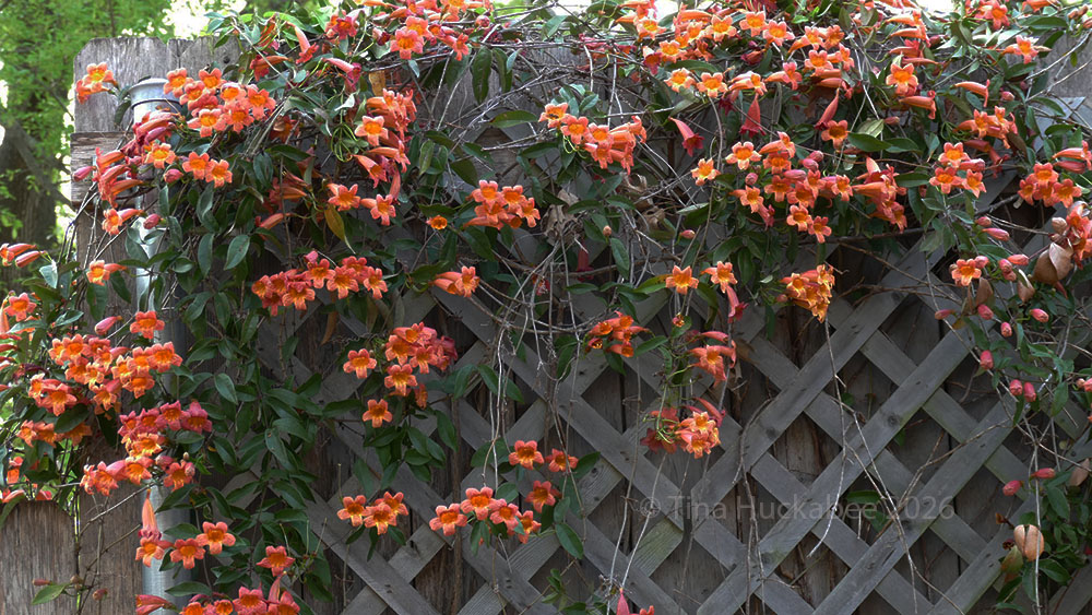 Crossvine doesn’t have a long bloom season. There is the initial, which lasts a few weeks, then usually a second crop later in spring. I see scattered blooms throughout summer.