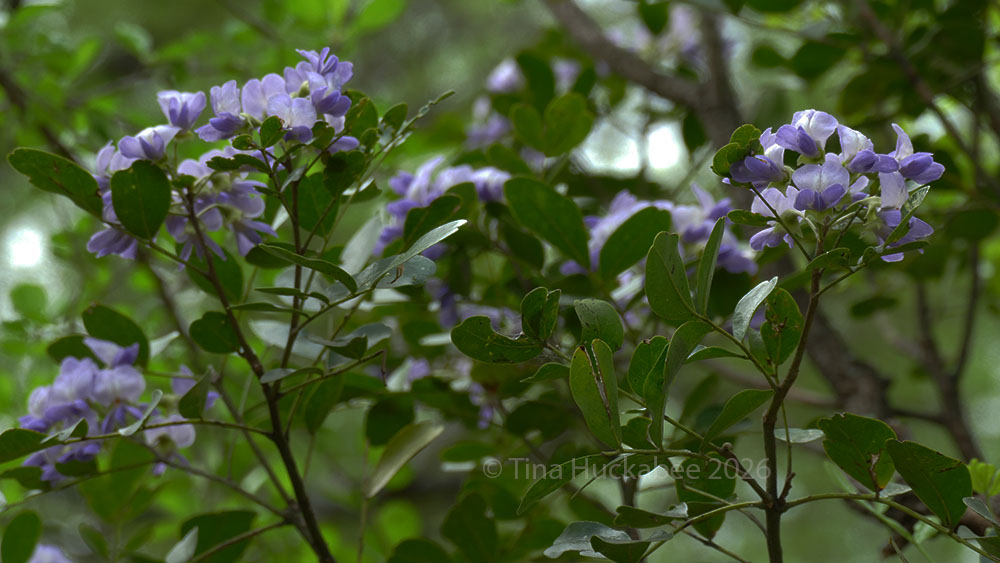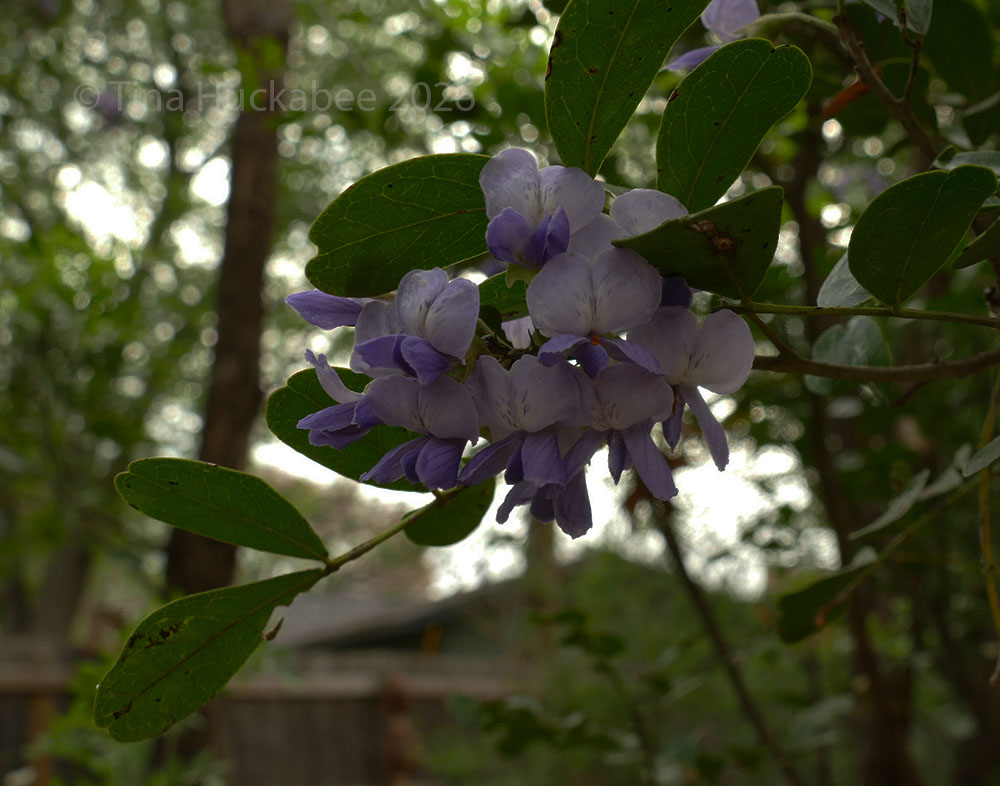 My very old Texas Mountain Laurel, Dermatophyllum secundiflorum, is on its way out of this life. Most of the top portions are bare, dead wood, but at the base where most of the foliage resides, a flush of blooms have danced their way to opening, purple bliss in color, grape soda in fragrance. The Laurel was one of the first things I planted decades ago and its been in decline for a while.