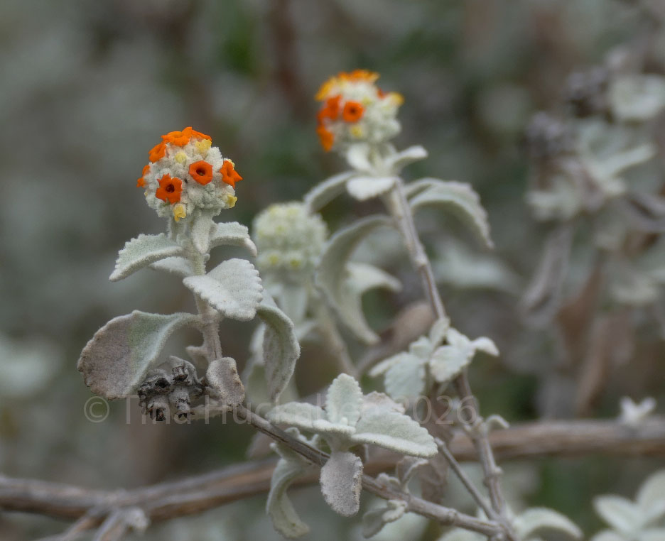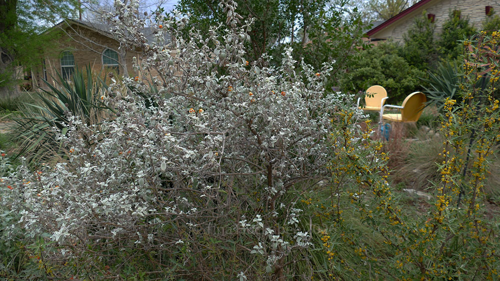 I love the unwieldy, silver-leafed Wooly Butterflybush, Buddleja marrubiifolia. Throughout the year, it stands as a signature specimen, a welcome change from greens in the garden. Interestingly, the Lady Bird Johnson Wildflower Center’s link mentions that the shrub is deciduous (looses its leaves during winter) and needs protection from hard freezes. Not so, mine! I’ve never protected it from any of our sporadic hard freezes and it stands full and grey/silver in all weather. It’s located facing west and near the street, so may it sit in a warmer micro-climate and is thus protected and ever full of foliage.