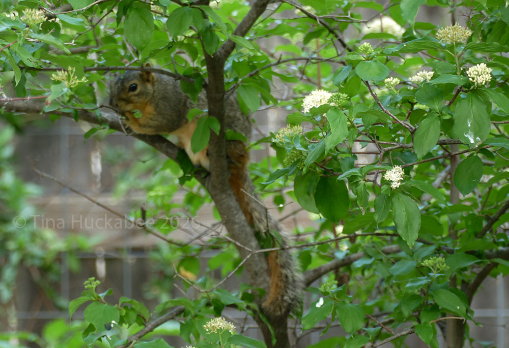 I caught a Grey Squirrel enjoying a mid-afternoon snack in my Rough-leaf Dogwood tree, Cornus drummondii.