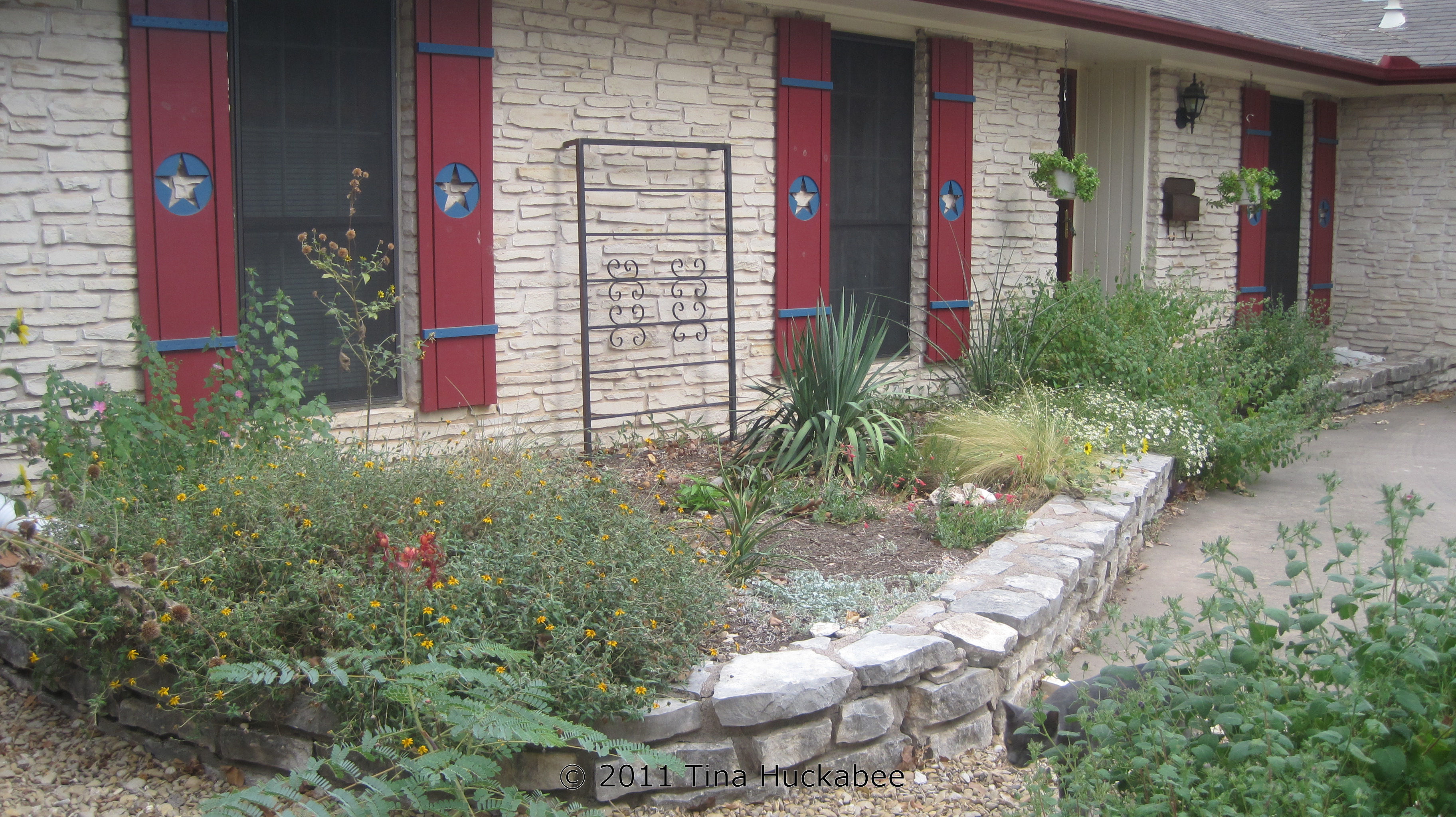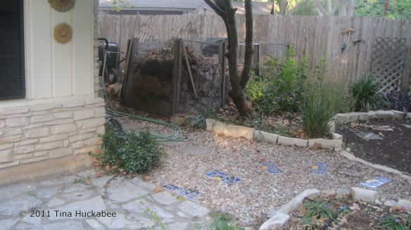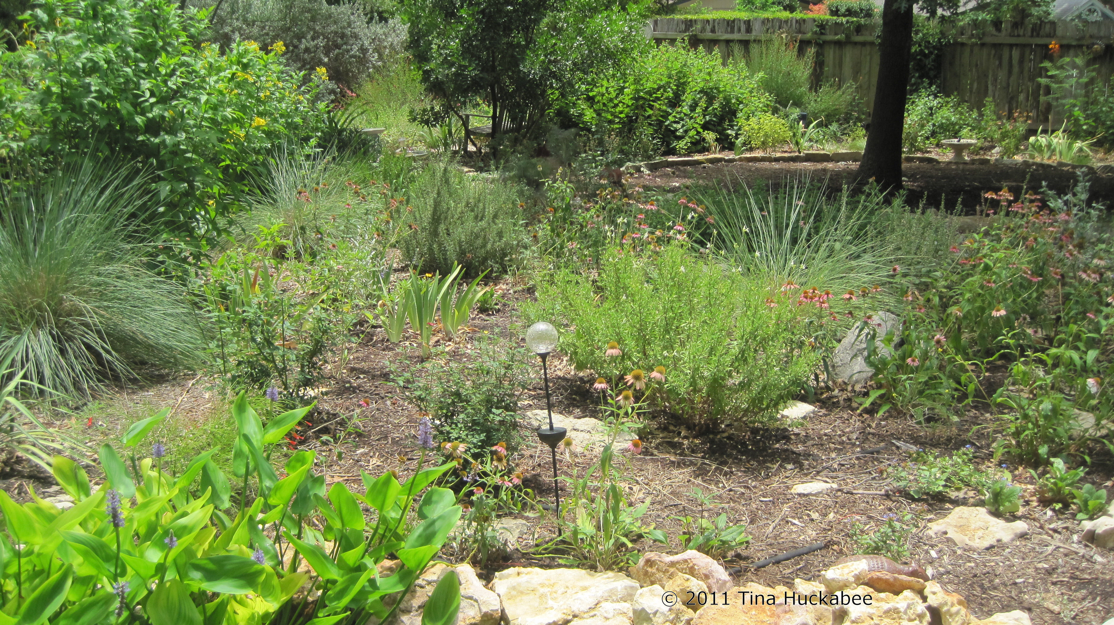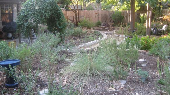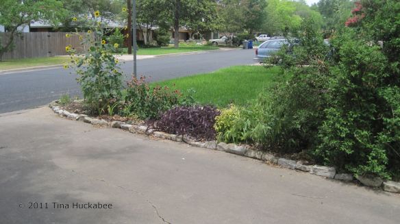 In August 2010, I undertook a re-landscape of all of my gardens. Lousy timing, I know considering that we’ve endured the worst single year drought in Texas history! But, it was time to freshen my gardens, mulch the areas where I let my grass die and extend some of the existing gardens. As of September 2011, I’m still working on this project and my landscape will require some tweaking. However, I’ve generally been pleased at my progress. I’ve planted only tough, Texas natives and lost few plants over the course this hateful, hellish summer. My water bill is still a fraction of what neighbors with St. Augustine grass pay. I hand water daily when I plant something new (for a week or two), then ease off the watering schedule. During the summer of 2011 I’ve watered once/week because I’ve added new plants to almost all of my gardens in the past twelve months. Some of my gardens can go two/three weeks without watering. My established gardens (gardens with no new plants) get watered only once/month.