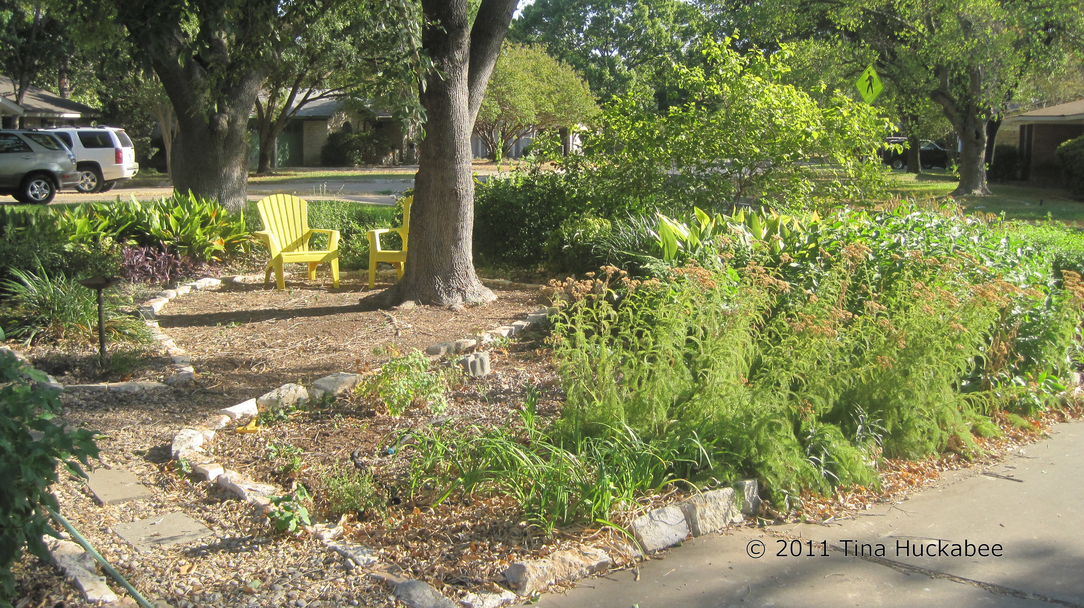By 1998, I had removed the grass of the main area along the driveway and street and installed a large perimeter garden. Initially, there was grass (surrounding the ash tree), but after a cold, dry winter (2000?) in which I chose not to keep the grass well-watered, it died and I replaced it with a mulched area. I added chairs so that it was a place for relaxing and enjoying the garden.