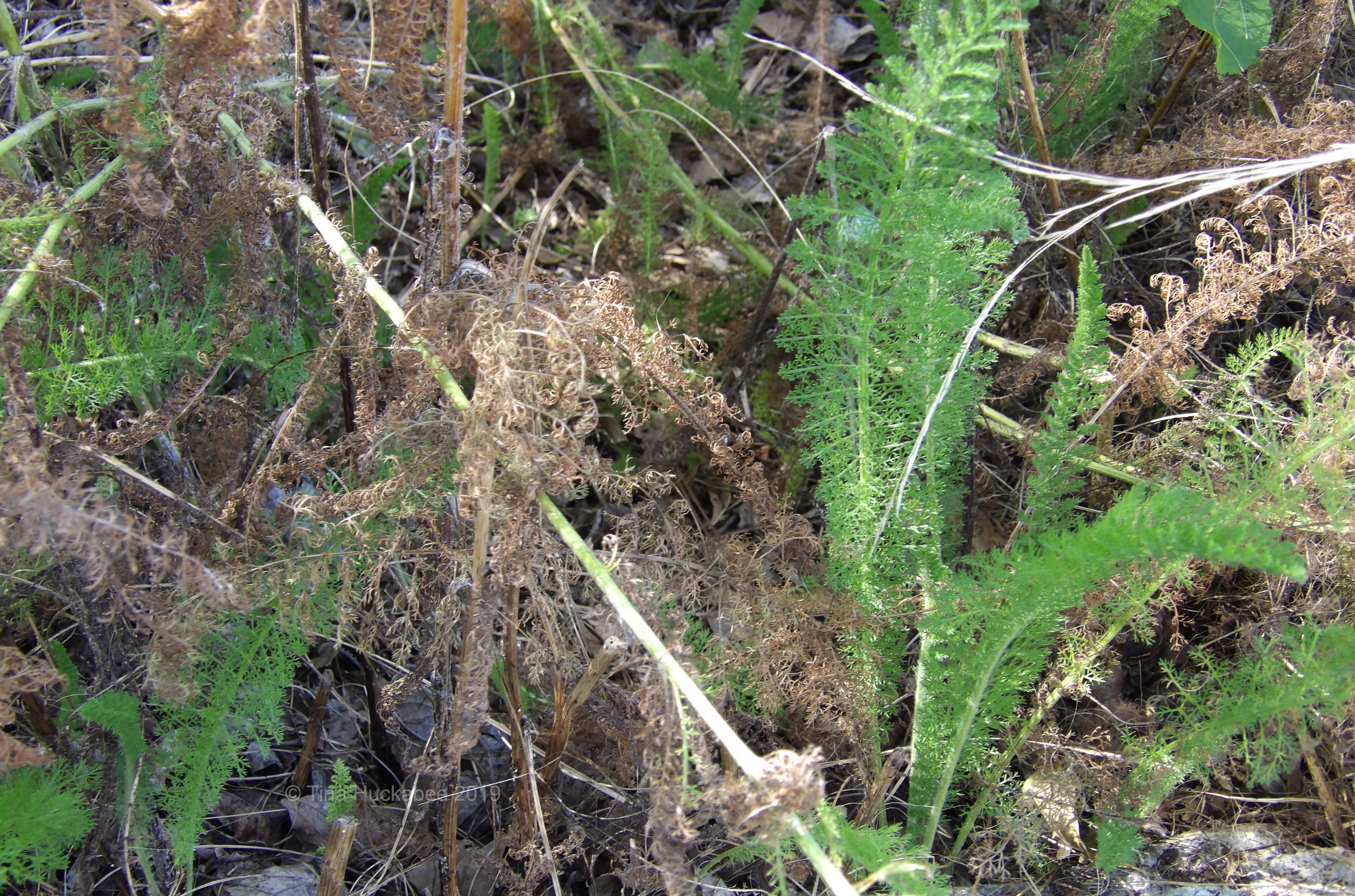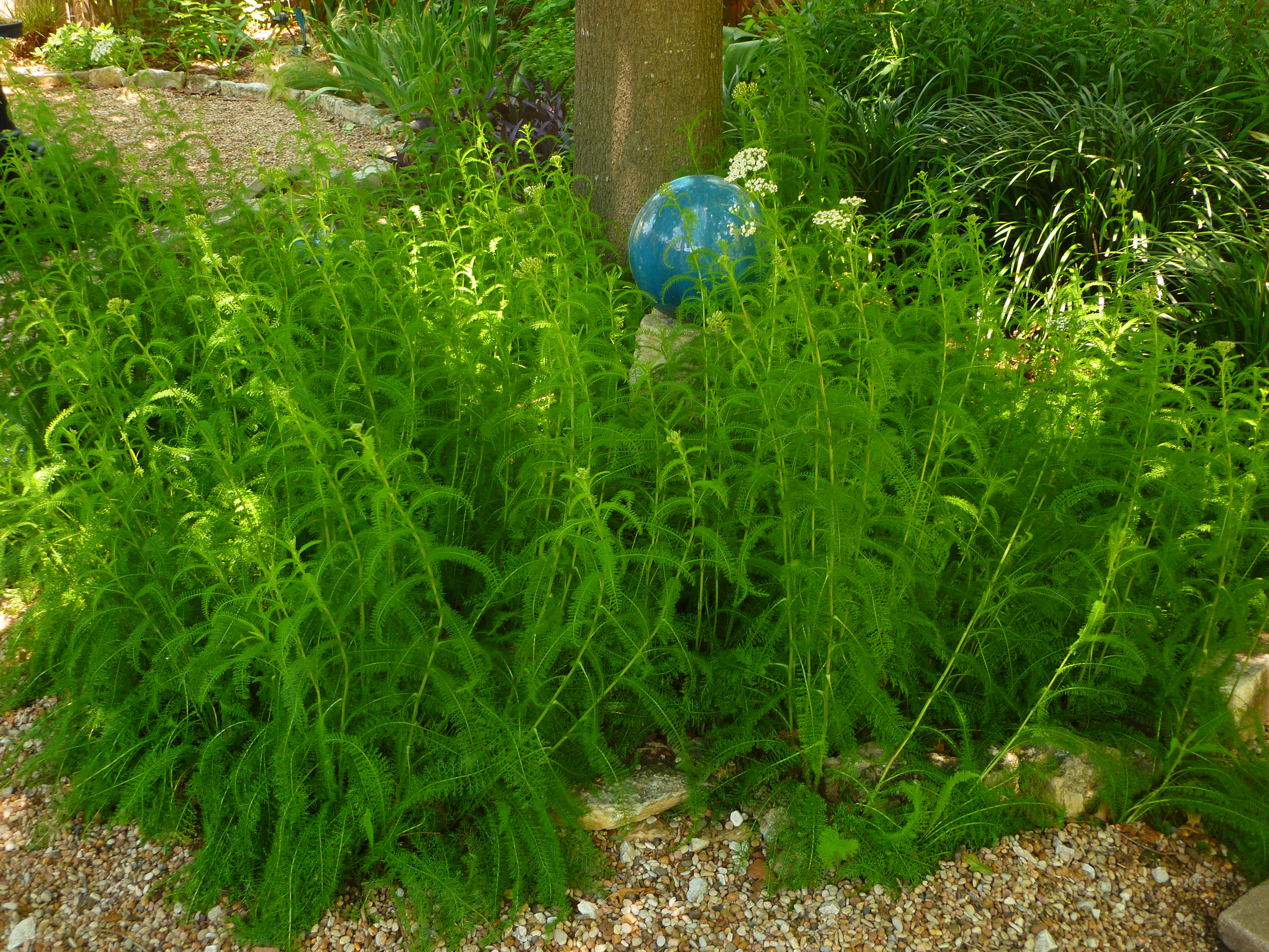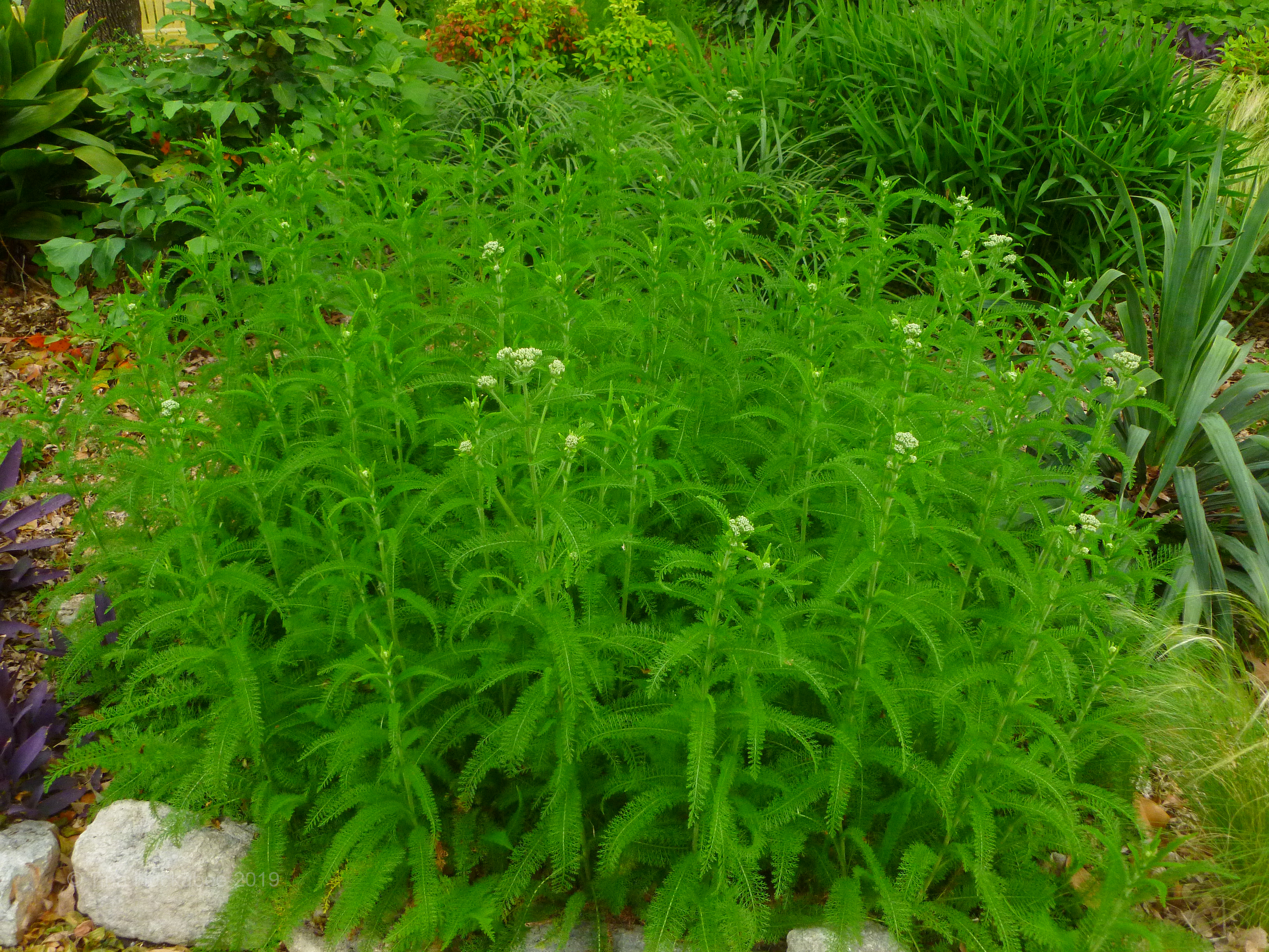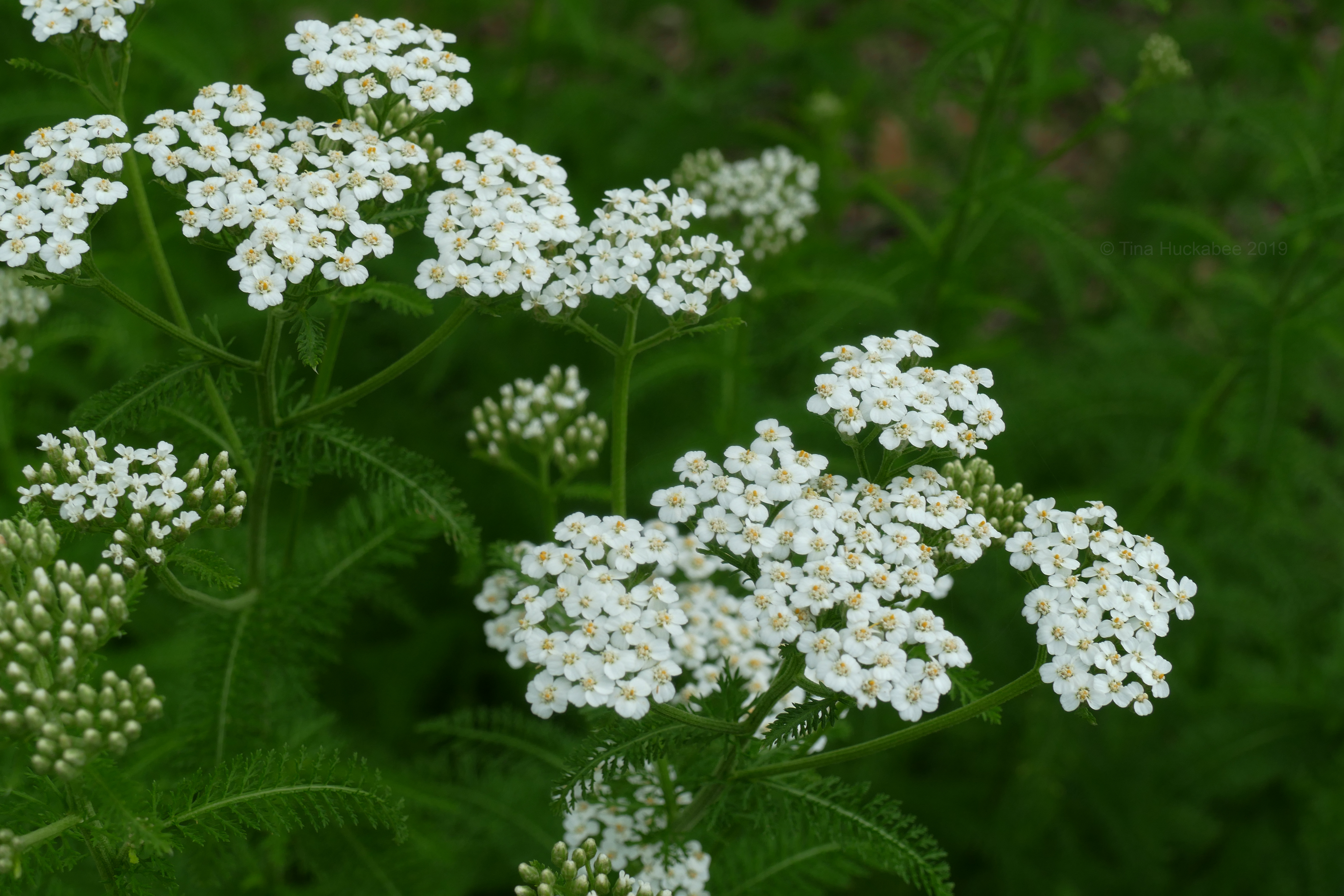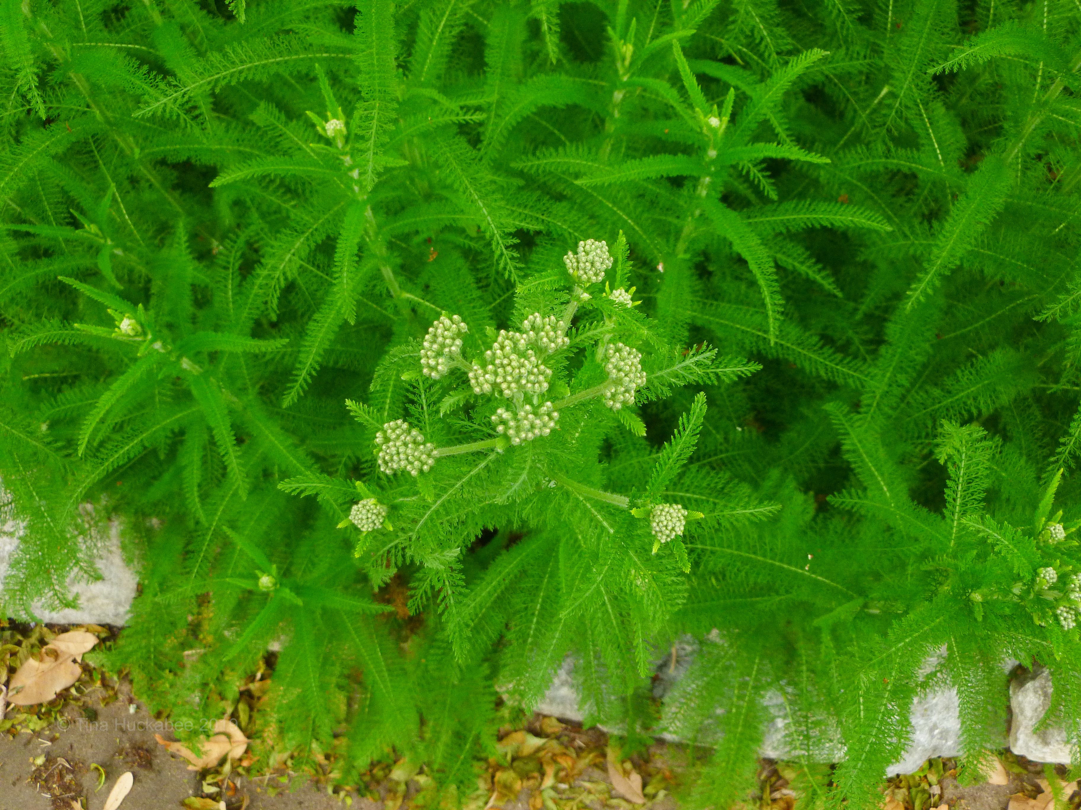 White flowers are refreshing and none more than those of Yarrow, Achillea millefolium. Feathery foliage pairs with these flat-topped clusters of tiny florets, just right for the smaller pollinators to work around. On this day, at this time, a fly works the blooms.