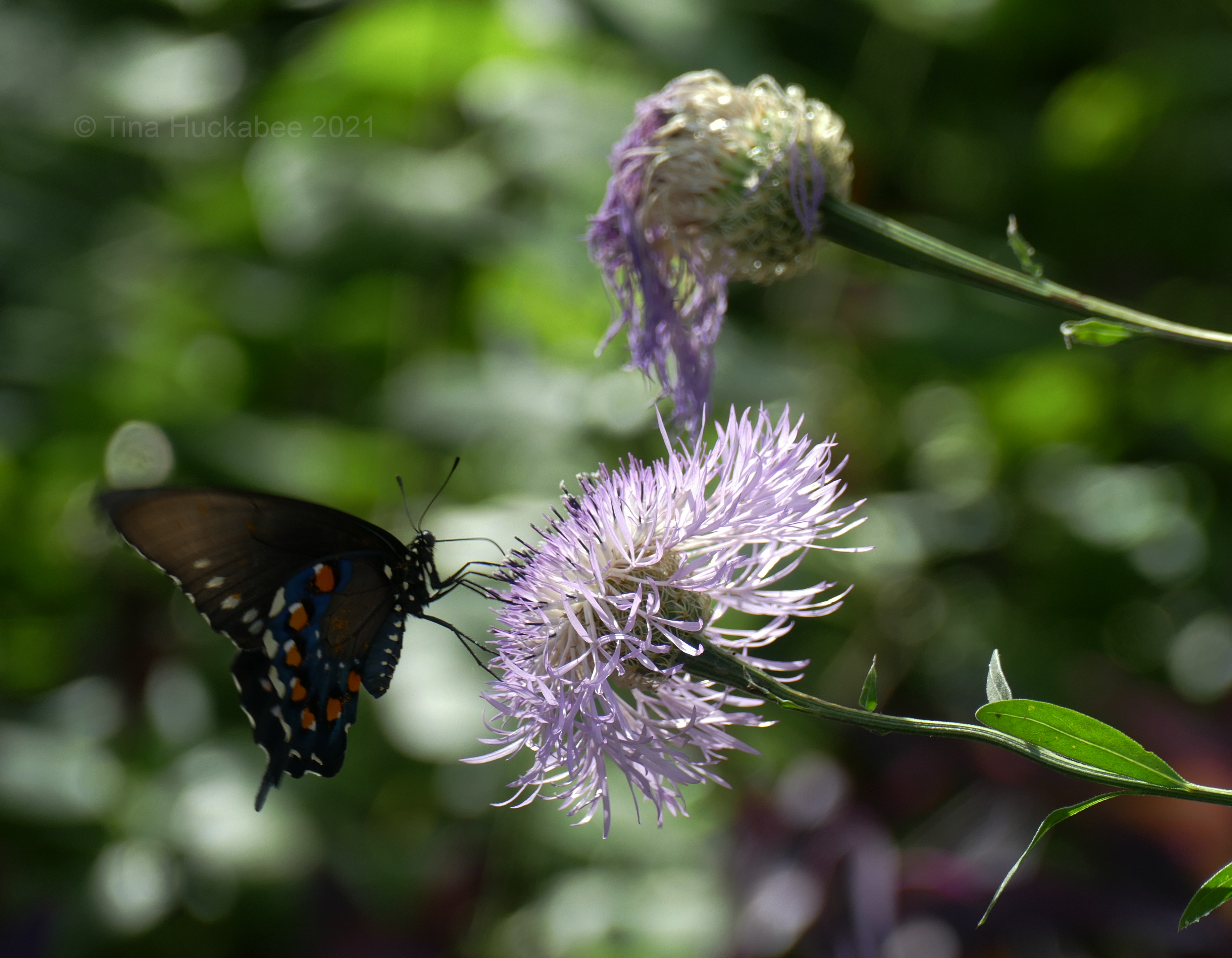I grow these annual native wildflowers, with thanks to Linda of Lagniappe and The Task at Hand, who several years ago graciously mailed to me seeds she’d collected. It’s taken a couple of years, but these regal annuals are now an integral part of my garden family, offering stature and elegance to my summer garden. This year, the basket flower stalks grew especially tall, some reaching to 9 and 10 feet. Most stalks were so tall that I couldn’t enjoy observing many of the blooms that opened atop the stalks. Pollinators filled the air above the garden, zooming from bloom to bloom for pollen and nectar. The lofty flowers certainly earned their keep, even if I was out of the loop. That said, the stalks are multi-branched, so while many flowers were too high for me to observe, there were plenty at human eye level–and their presence was welcome by those wishing only to admire.