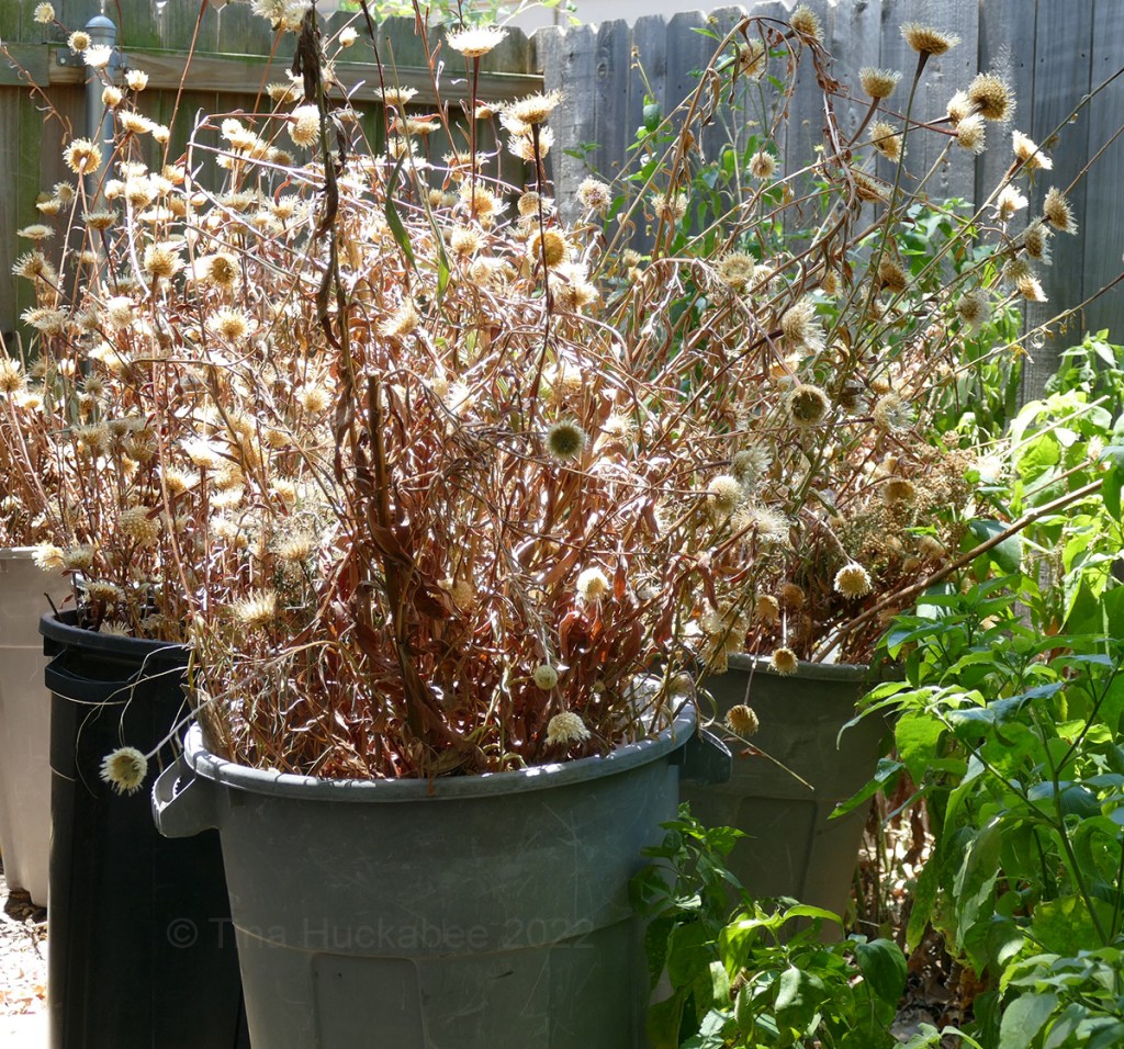 It’s hard to say farewell to a species of plant whose end has come, especially one that produced such an abundance of flowers. Alas, my American Basket flowers, Centaurea americana, are done for the year. This is a sad sight: