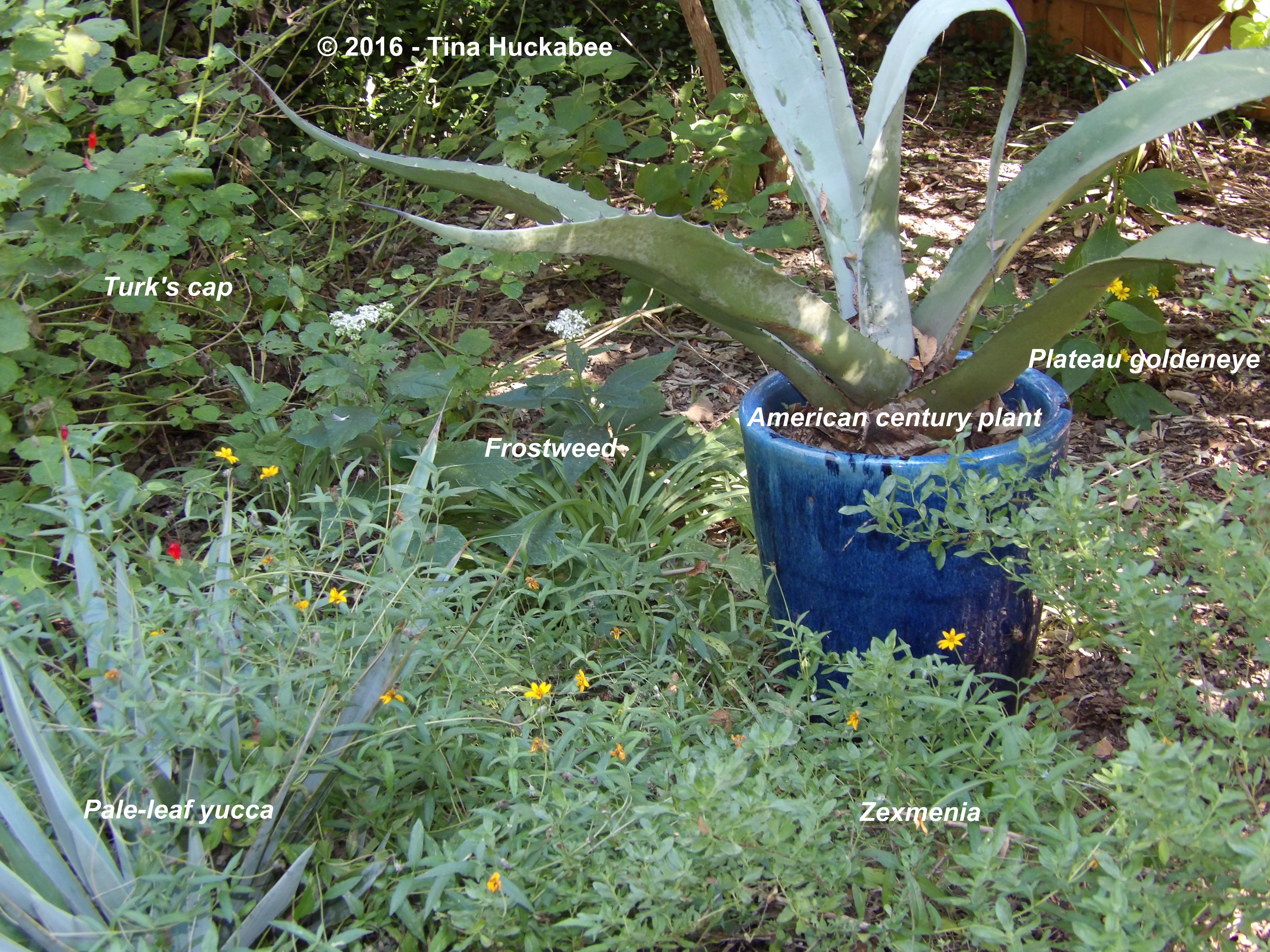 Garlic chives (bottom left), Pale-leaf yucca (center), and Autumn sage (bottom right) round out the perennial plants in this garden.