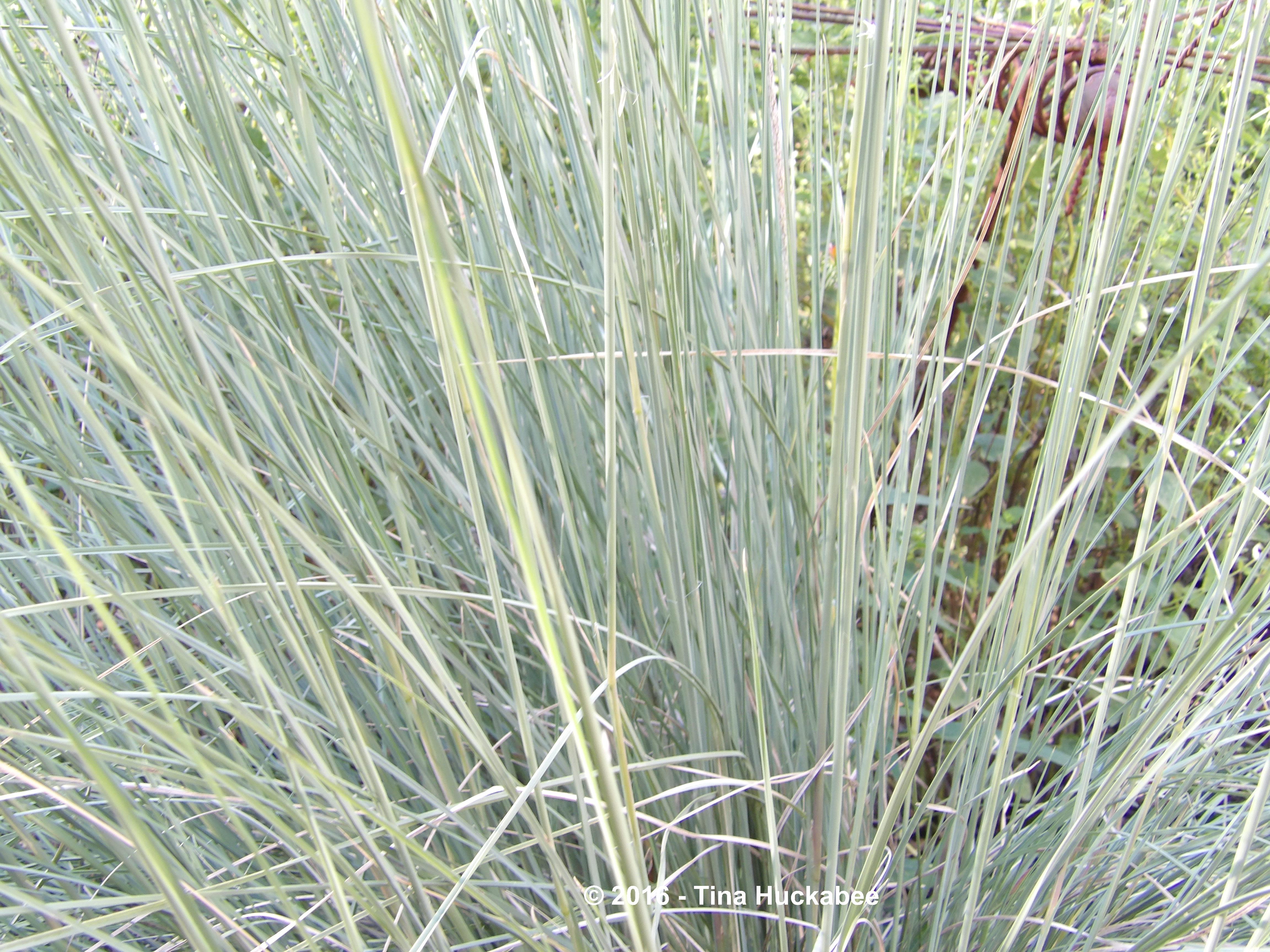 An emerging Big muhly, Muhlenbergia lindheimeri, just in front of the silly bird, tolerates the Heartleaf buddying-up to it.