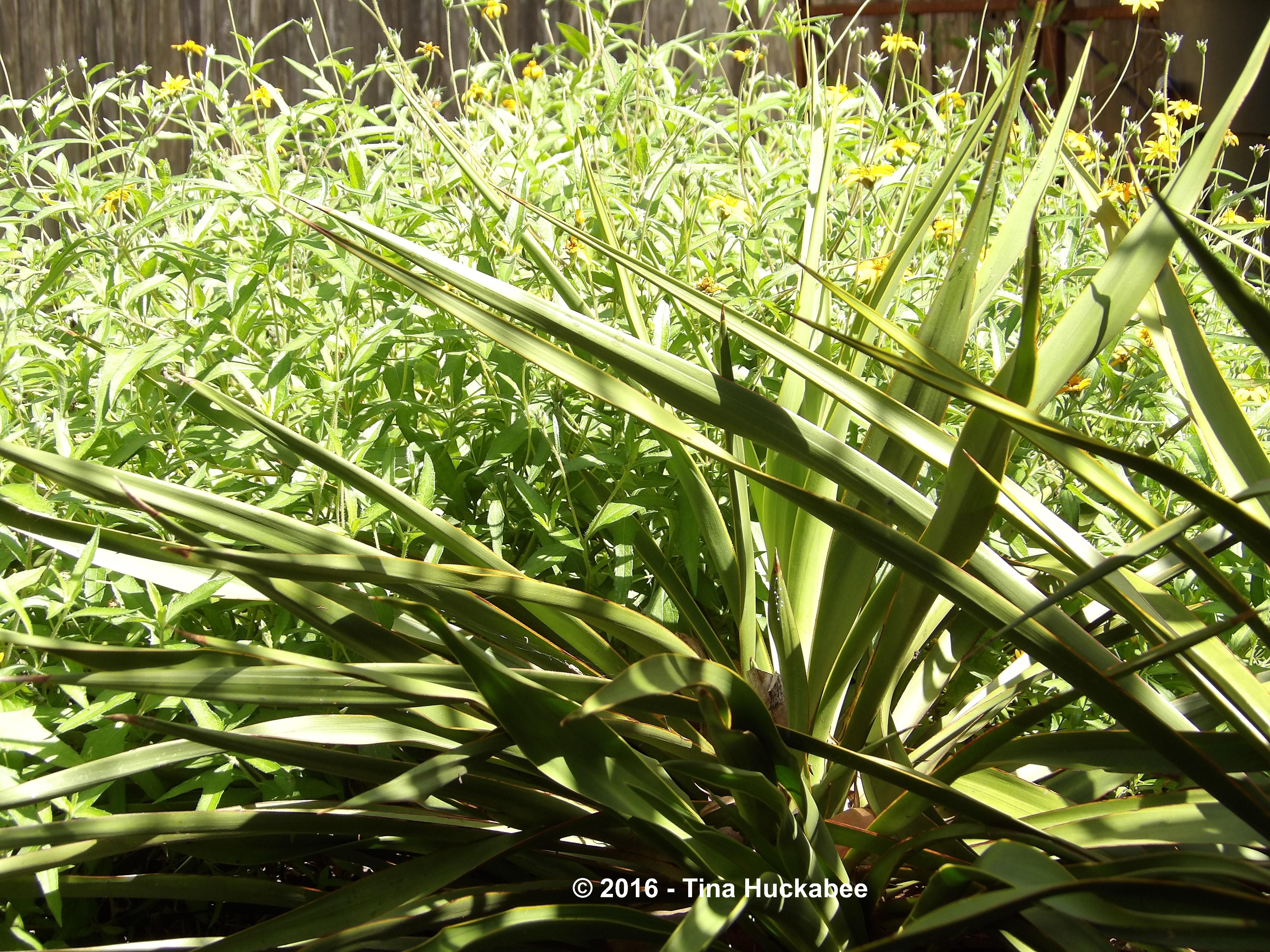 Blue-grey in color and barb-sharp in form is this Pale-leaf yucca, Yucca pallida, sitting alongside the Heartleaf skullcap,