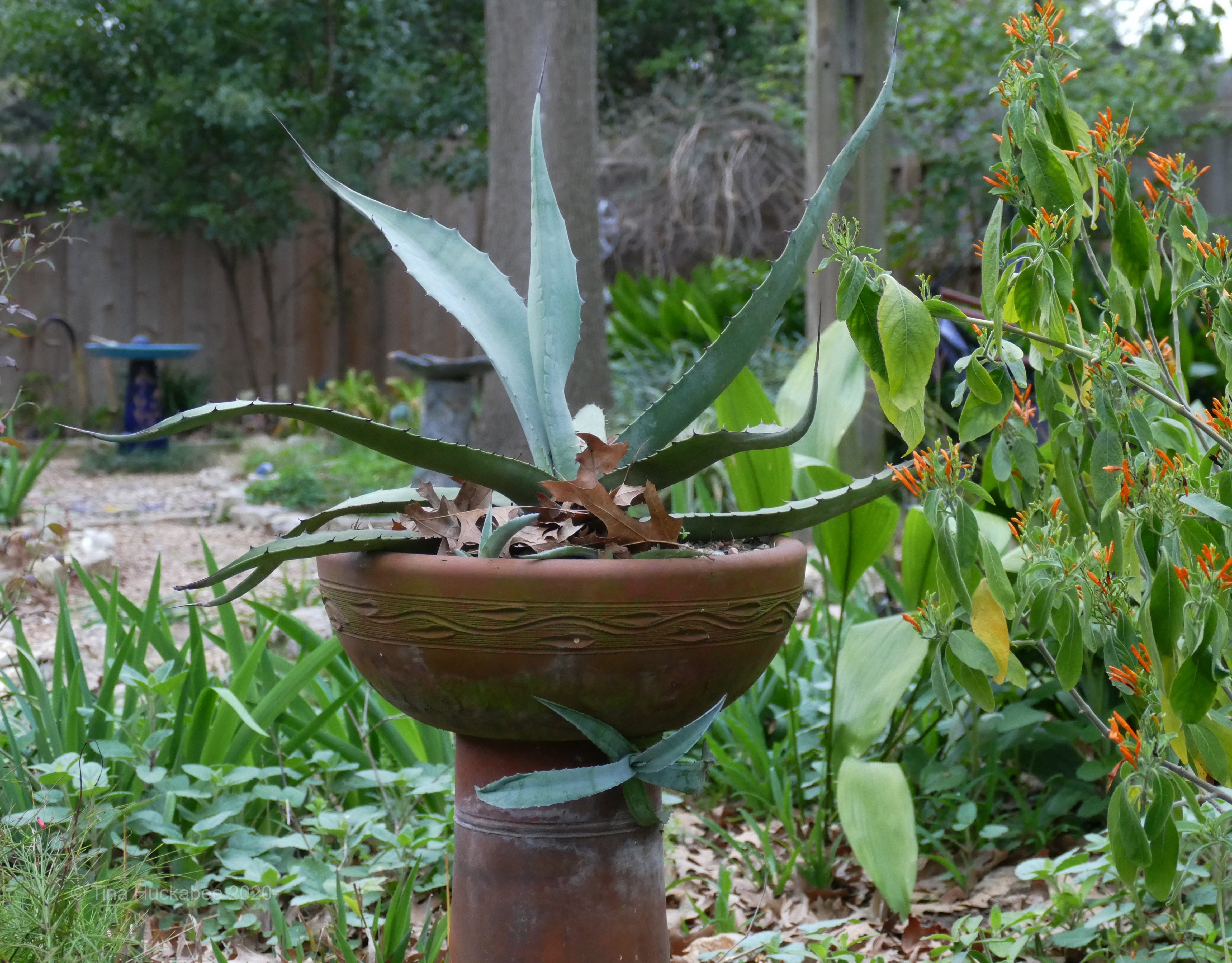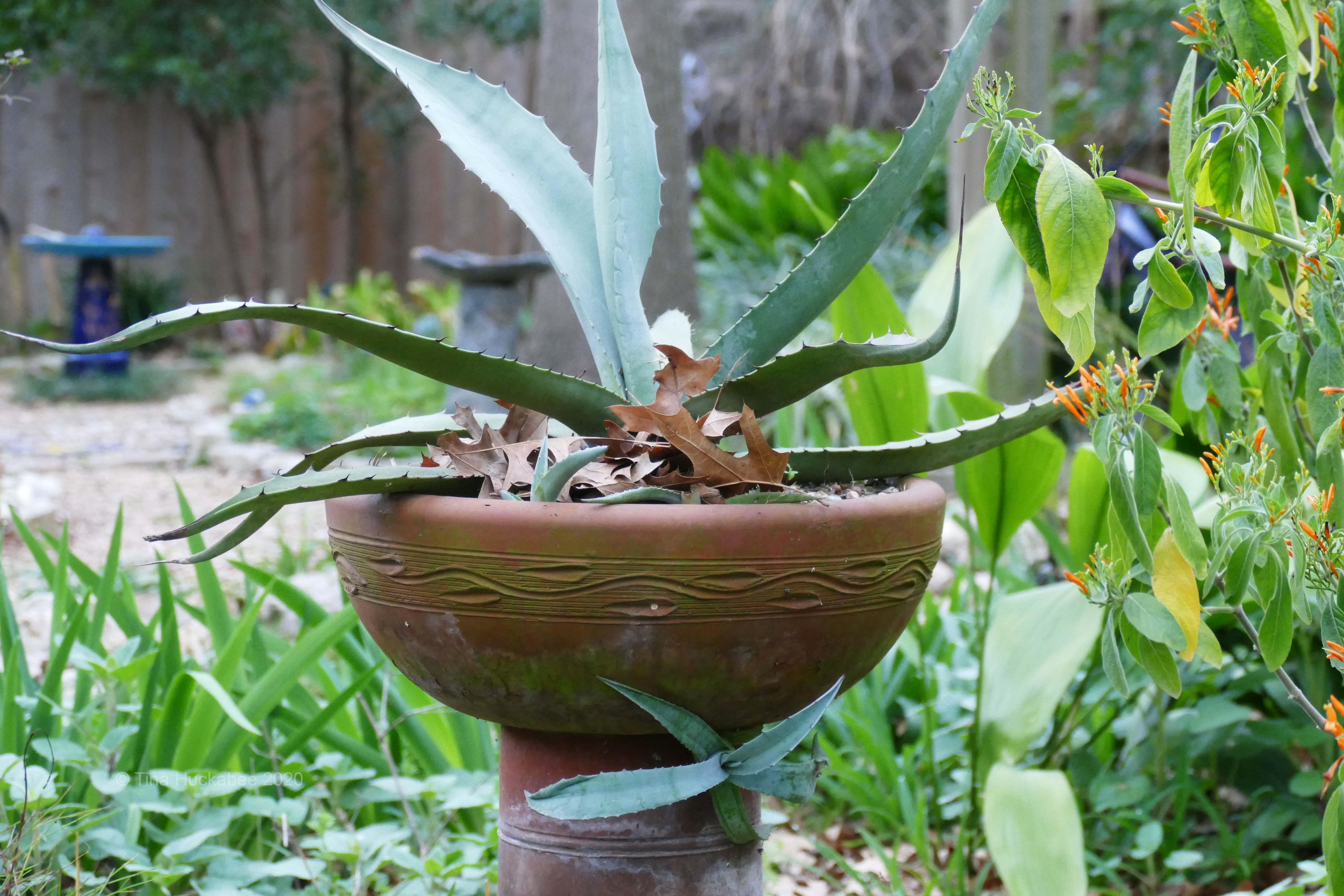 The focal point of this part-shade garden rests on a blue pot full of an eye-catching silver-green American century plant, Agave americana.