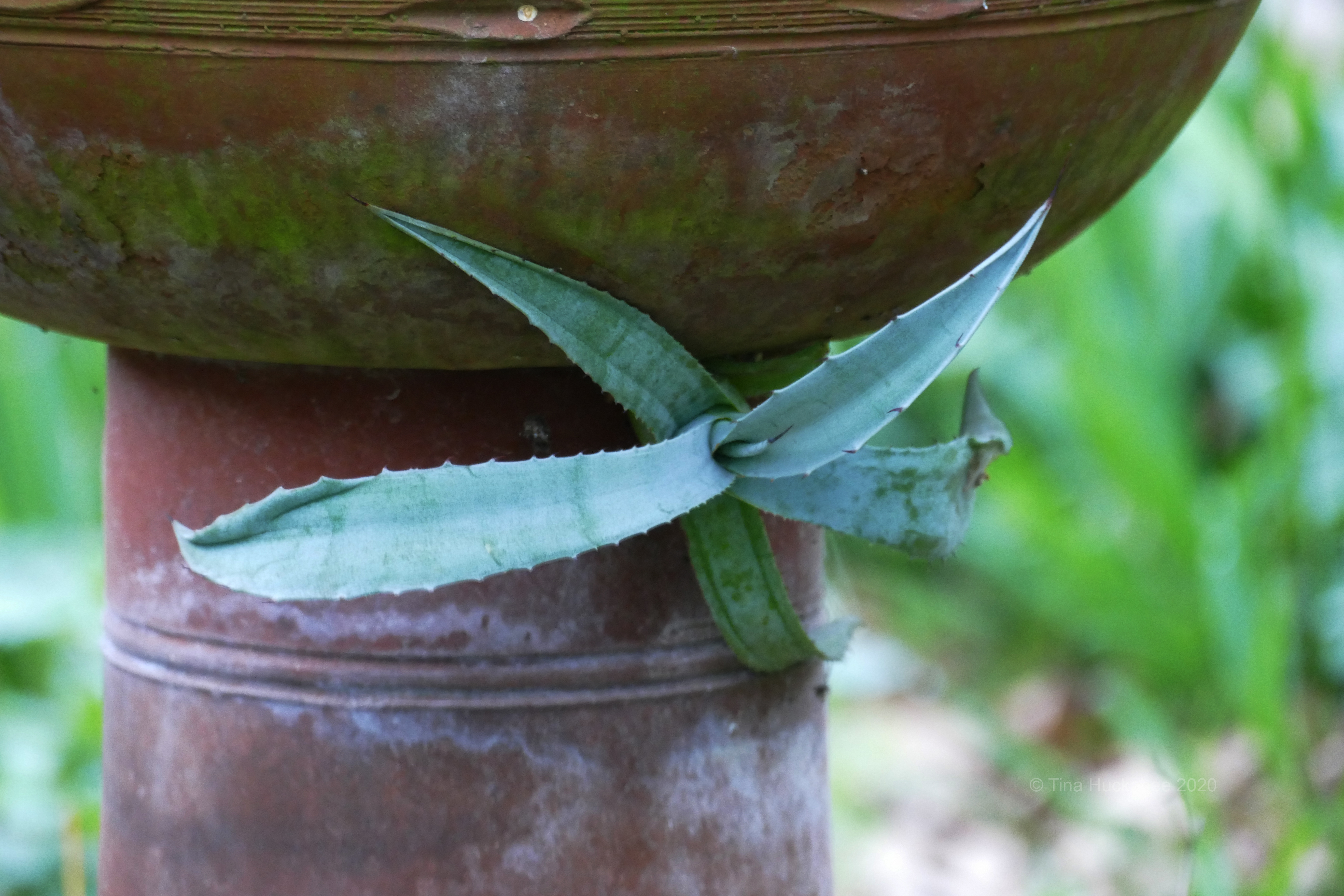 The Big muhly complements both agave plants with its similar shape and slender, grass-like foliage. Unfortunately, this specimen struggles a bit and doesn’t grow as large or as full as it should; it would thrive with more sun.